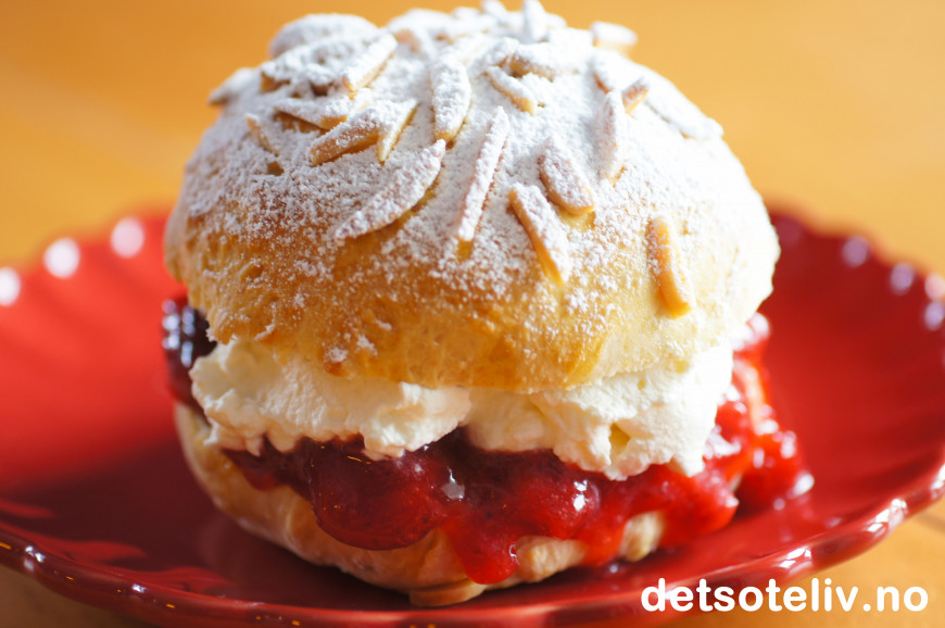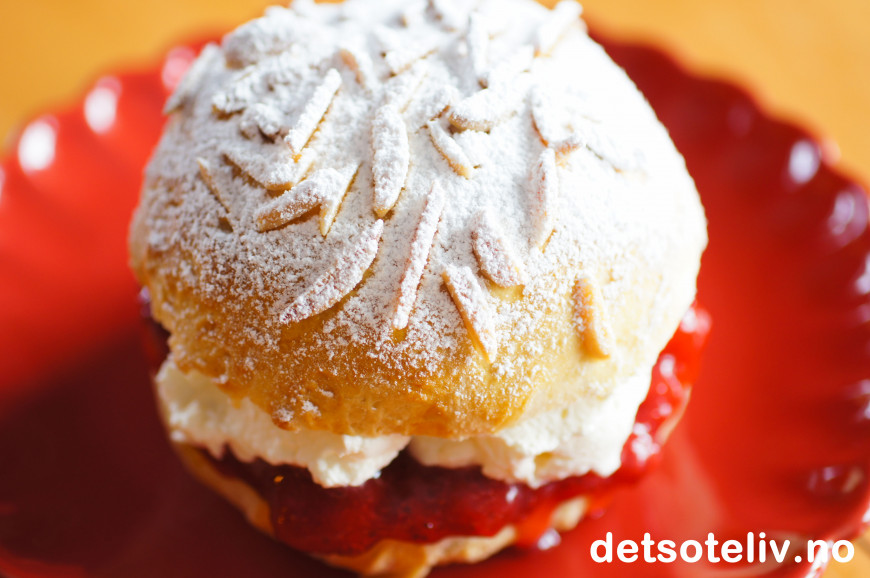 Før servering deles bollene i to. Pisk kremfløten til krem og smak til med vaniljesukker.