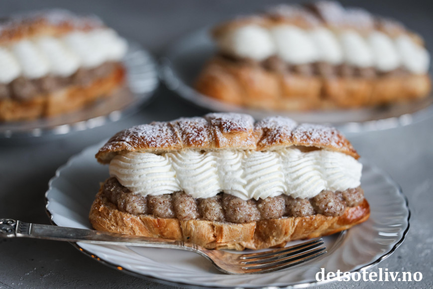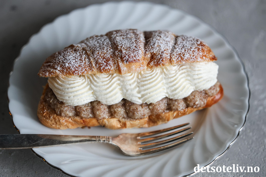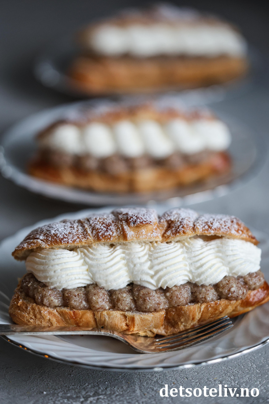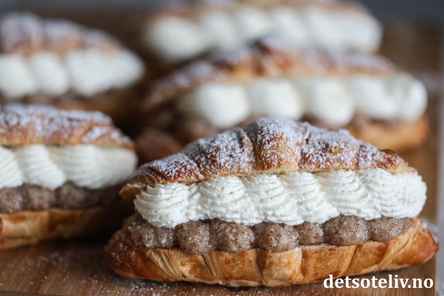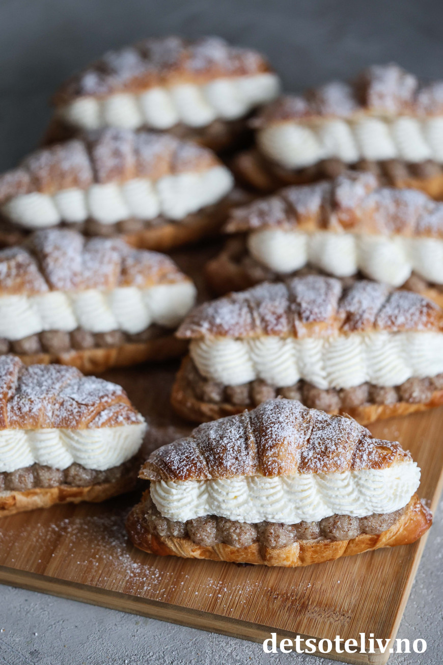 Jeg har her brukt ferdigkjøpte croissanter, som jeg fyller med hjemmelaget mandelkrem og pisket fløtekrem.