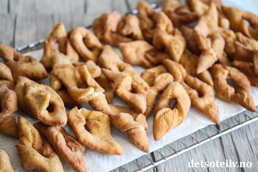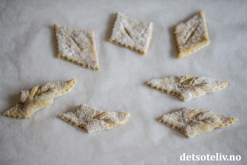 Bruk resten av melet i utbakingen, men bruk så lite som mulig. Jo mindre mel, jo finere kaker (se tips). Kjevle ut litt og litt deig av gangen (la resten av deigen stå i kjøleskapet imens). Kjevle ut deigen veldig tynt og skjær ut snipper med bakkelsspore. Lag et snitt i midten og "smett" den ene enden av kaken inn gjennom hullet. Legg kakene på et melet brett etter hvert som de er ferdig formet.