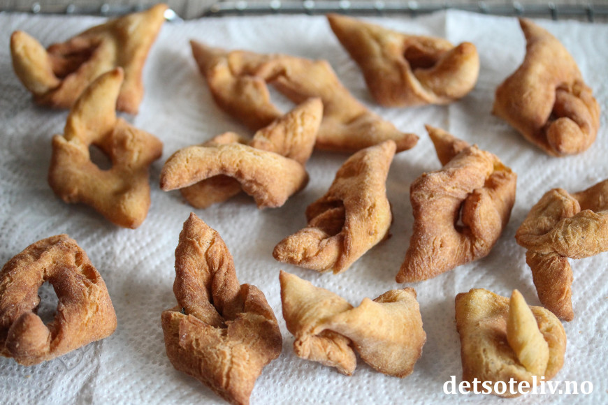 Smelt smulten i en gryte eller bruk frityrkoker dersom du har det. Stek kakene i smult som holder ca. 180°C (se tips). Kakene synker først til bunns, men flyter deretter opp og sveller mens de steker. Snu på dem etter hvert, slik at de blir jevnt stekt. Avkjøl kakene på kjøkkenpapir som trekker til seg overflødig fett.