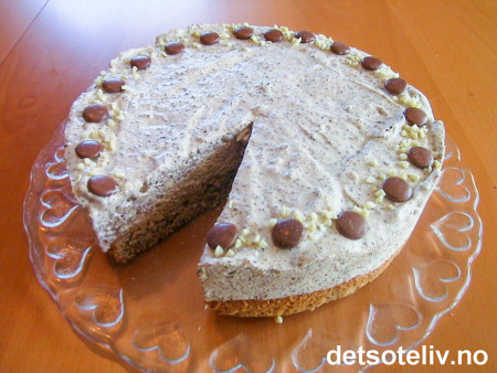 Ha deigen i en rund kakeform (22 cm i diameter) med bakepapir i bunnen. Stek kaken midt i ovnen ved 150°C i 35-40 min. Avkjøl kaken helt i formen. Løsne kaken forsiktig fra formen med en skarp kniv. Ta kaken ut av formen og fjern bakepapiret. Vask kakeformen og ha kaken tilbake i den rene formen (se tips).
