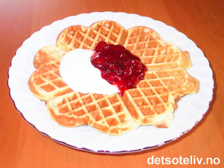 Vaflene smaker veldig godt sammen med rømme og syltetøy.