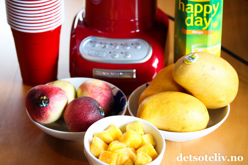 ♥ Når du bruker frosne mangobiter, trenger du færre isbiter for å få en kjølende smoothie. Jeg har her brukt fersk, gul mango, som har den definitivt beste mangosmaken, så kjøp denne typen hvis du får tak i. Ellers duger jo den grønne typen mango selvfølgelig også, men den bør helst være søt og godt moden. Mangojuice fås kjøpt i velassorterte matbutikker, og er også viktig for å få skikkelig god mangosmak på smoothien.