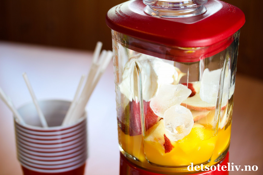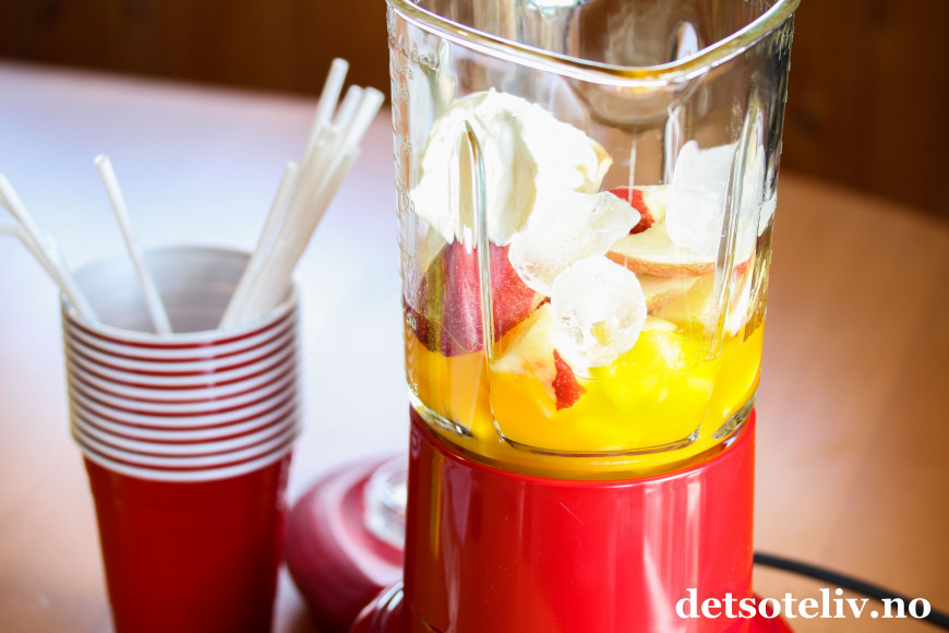 De små, røde flekkene i smoothien kommer fra ferskenskallet, og jeg synes det bare ser dekorativt ut.
