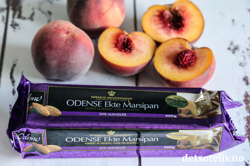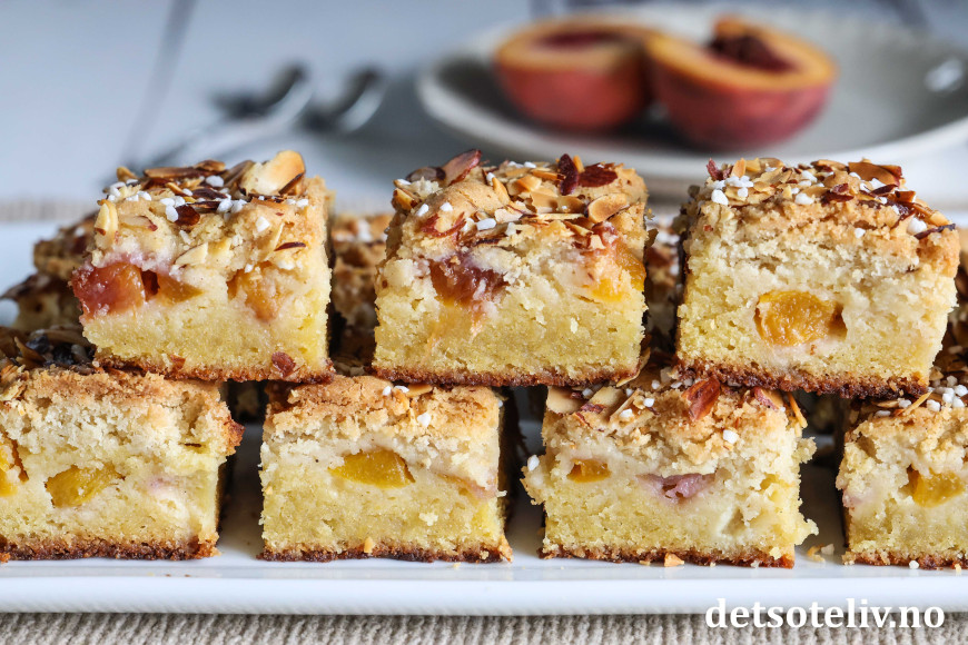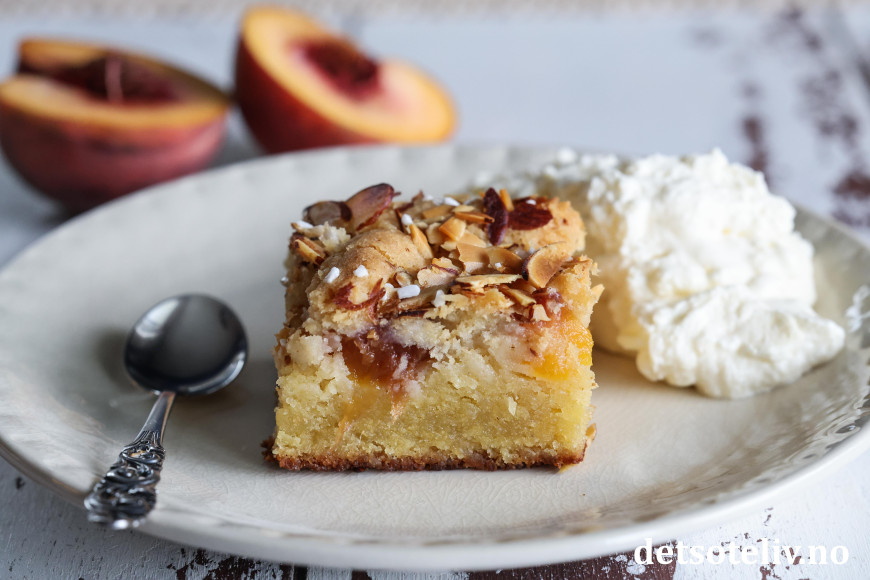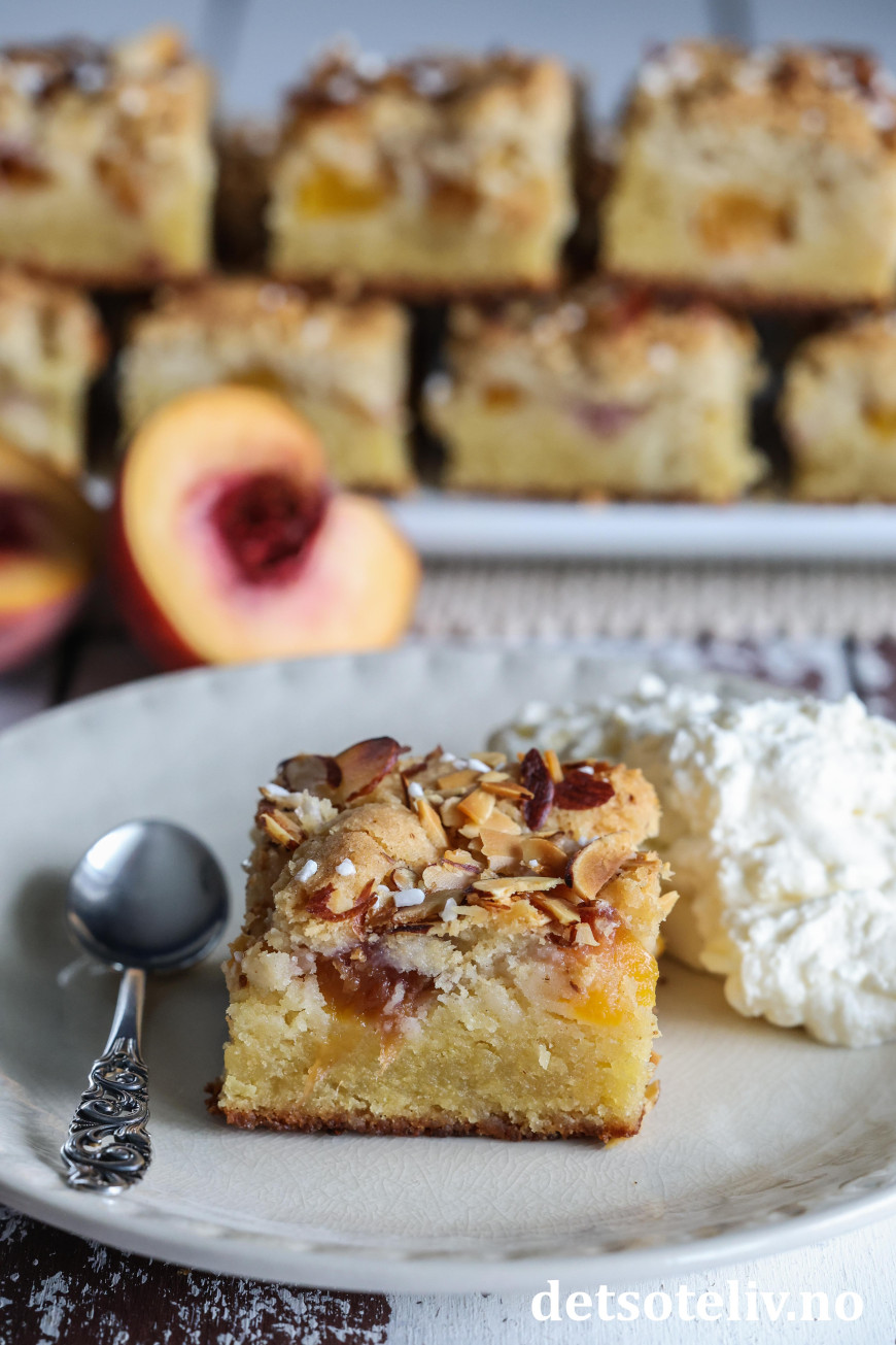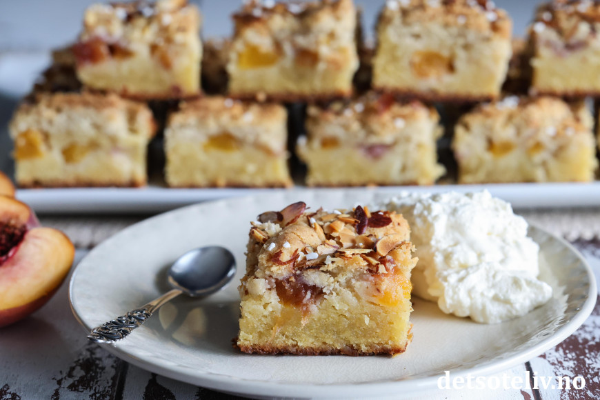 Dette er en utrolig saftig og nydelig kake med fersken. Deigen inneholder revet marsipan, som gjør kaken veldig myk og god på smak. Kaken toppes med en smuldredeig som blir herlig sprø.