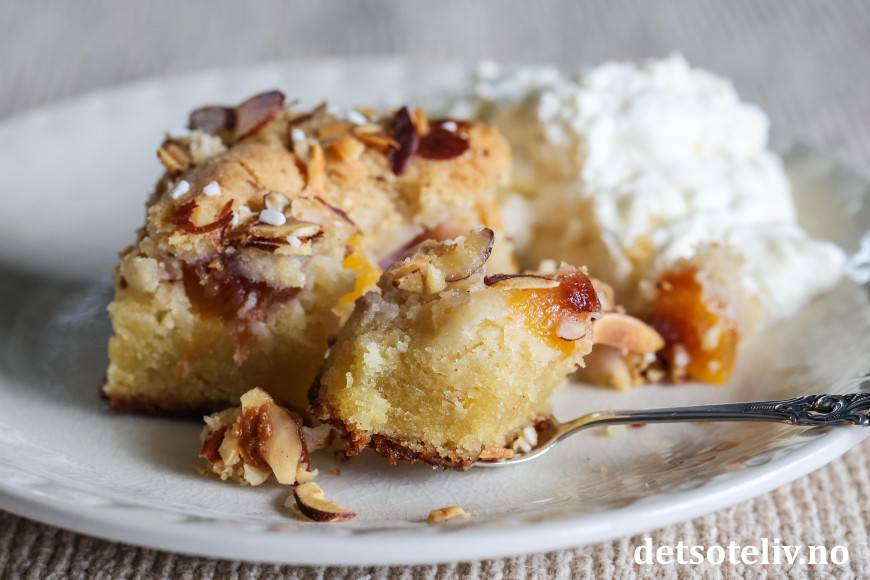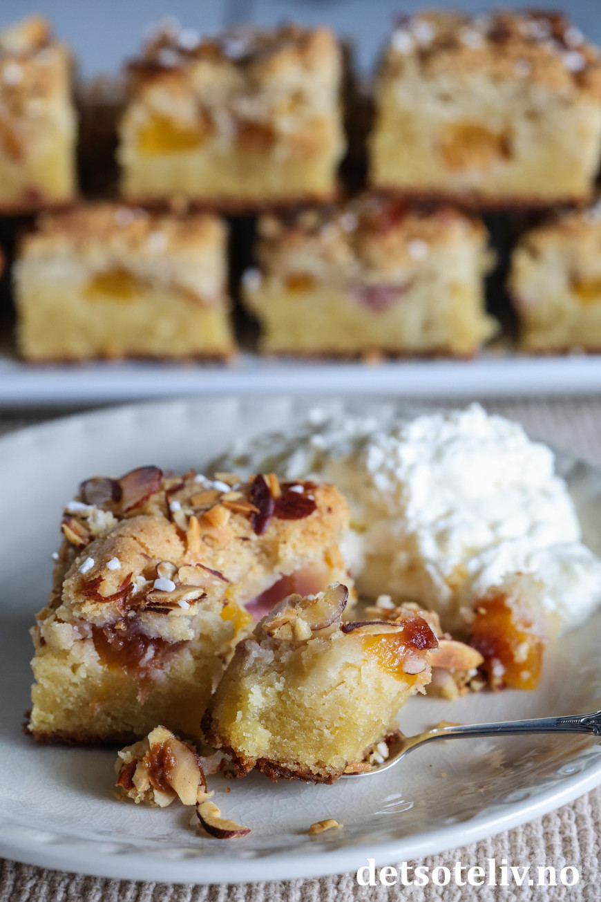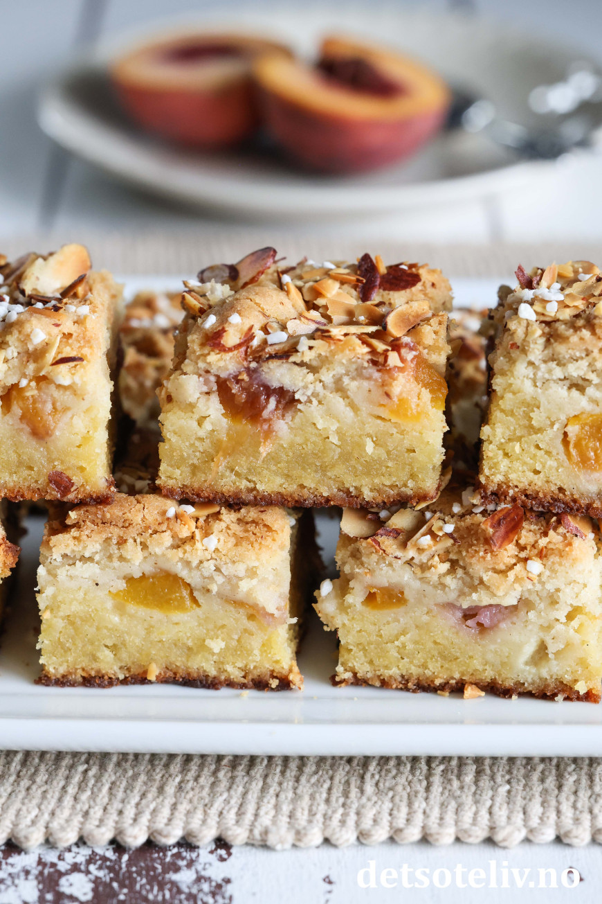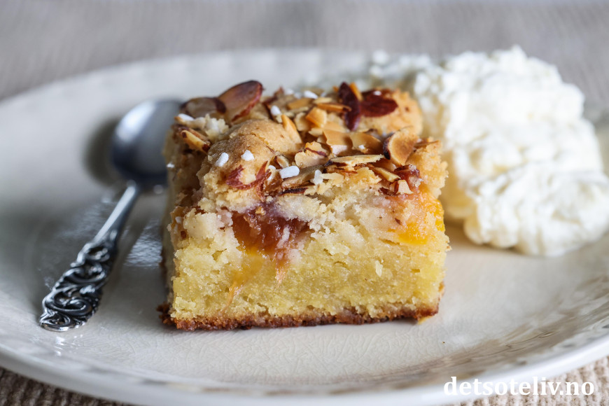 Dette er en utrolig saftig og nydelig kake med fersken. Deigen inneholder revet marsipan, som gjør kaken veldig myk og god på smak. Kaken toppes med en smuldredeig som blir herlig sprø.