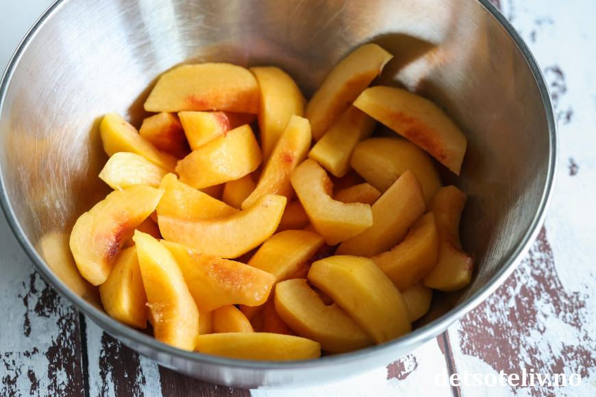 Skjær fersken i båter og skjær bort skallet. Skjær båtene deretter i små biter. Fordel ferskenbitene over deigen og dryss over sukker.