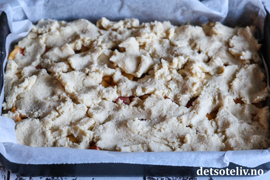 Klem deigen ut til flak med hendene og legg over ferskenbitene (det gjør ikke noe om deigen ikke dekker kaken helt).