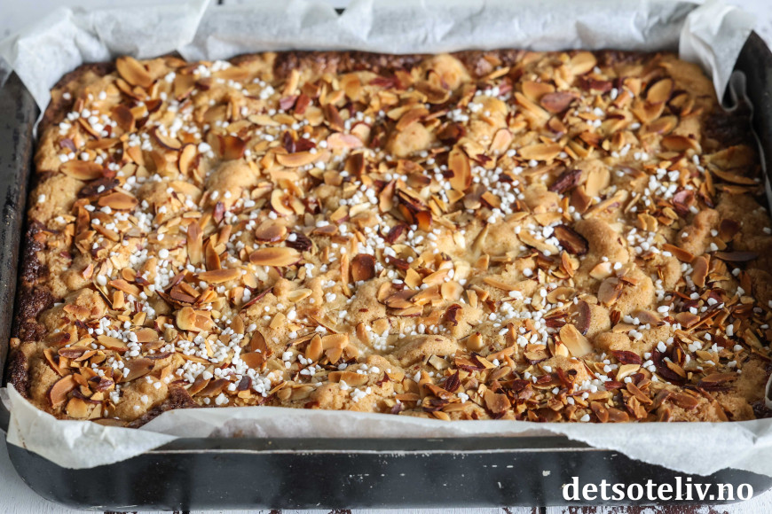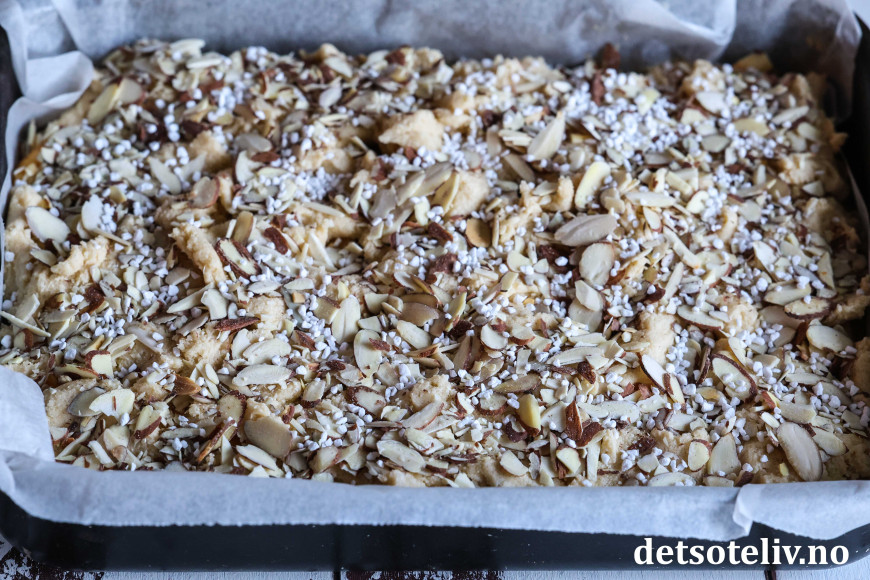 Ha deigen i en liten, bakepapirkledd langpanne (ca. 20 x 30 cm) og jevn til overflaten.