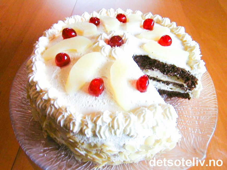 Fordi kaken er dekket med pisket krem, smaker den best samme dag som den er fylt.