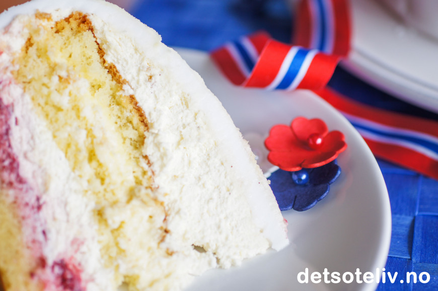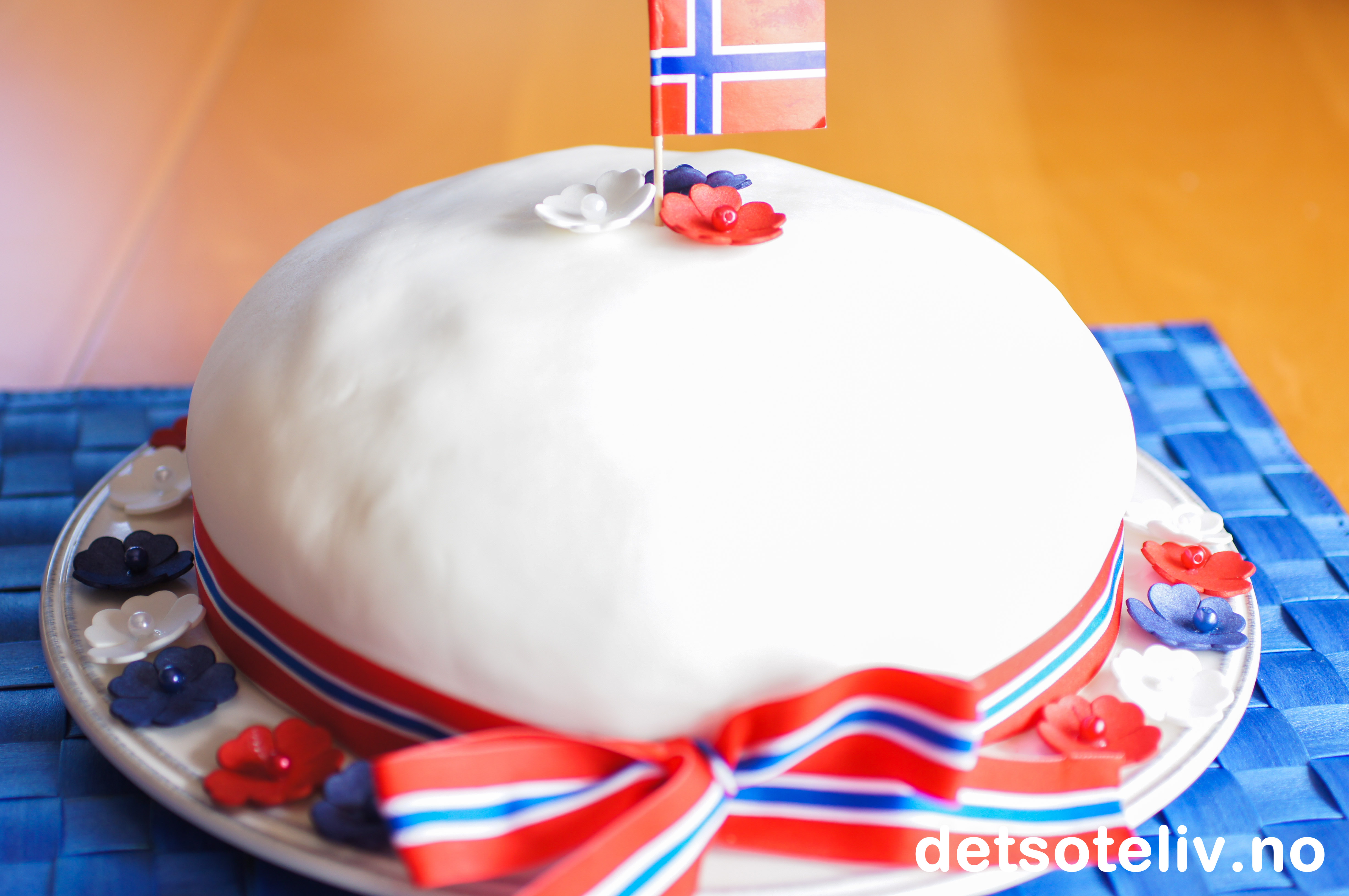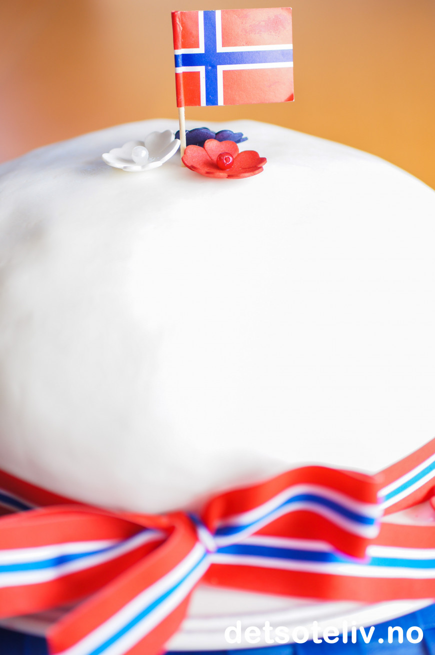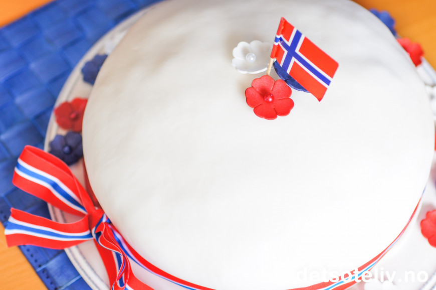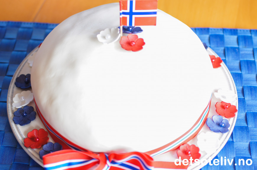 Pynt kaken med kakebånd, små flagg eller annet i rødt, hvit og blått.