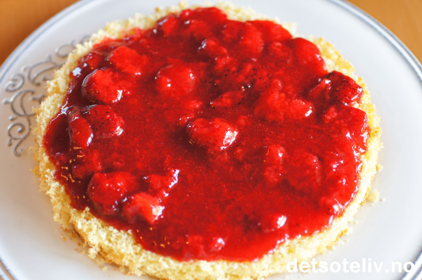Bre jordbærsyltetøy på den første kakebunnen. Dekk med pisket krem som er blandet med litt jordbærsyltetøy og legg på den andre kakebunnen. Dekk den med vaniljekrem og legg på den tredje kakebunnen.