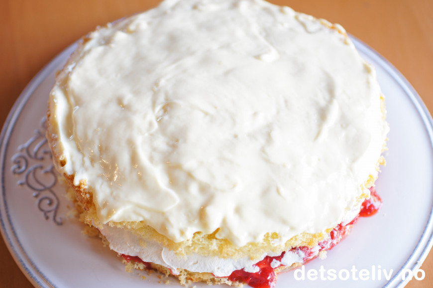 Dekk med pisket krem som er blandet med litt jordbærsyltetøy og legg på den andre kakebunnen. Dekk den med vaniljekrem.