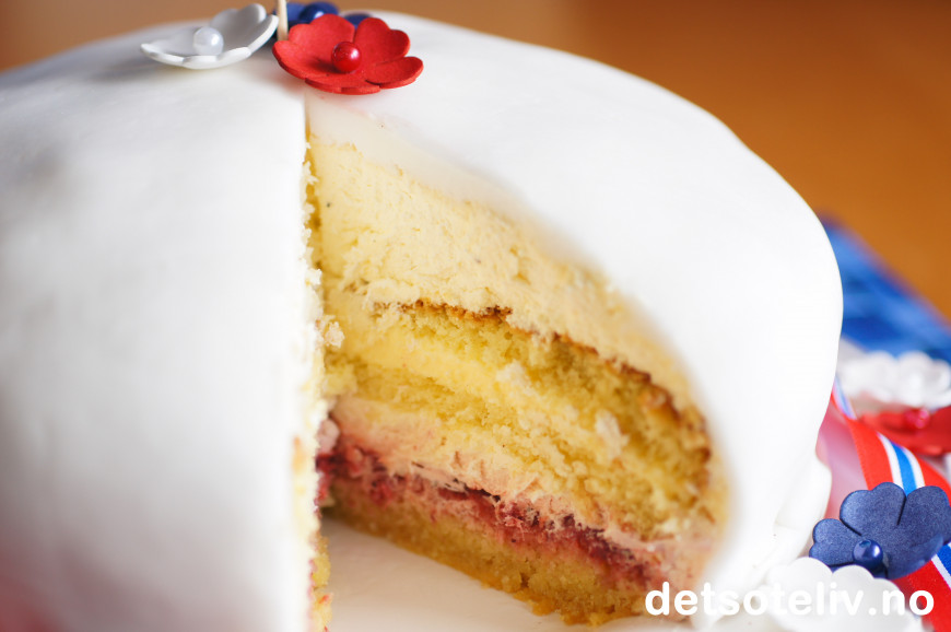 Her har du enda et supert forslag til 17. mai-kake, som er en kuppelformet marsipankake fylt med jordbær og vaniljekrem.