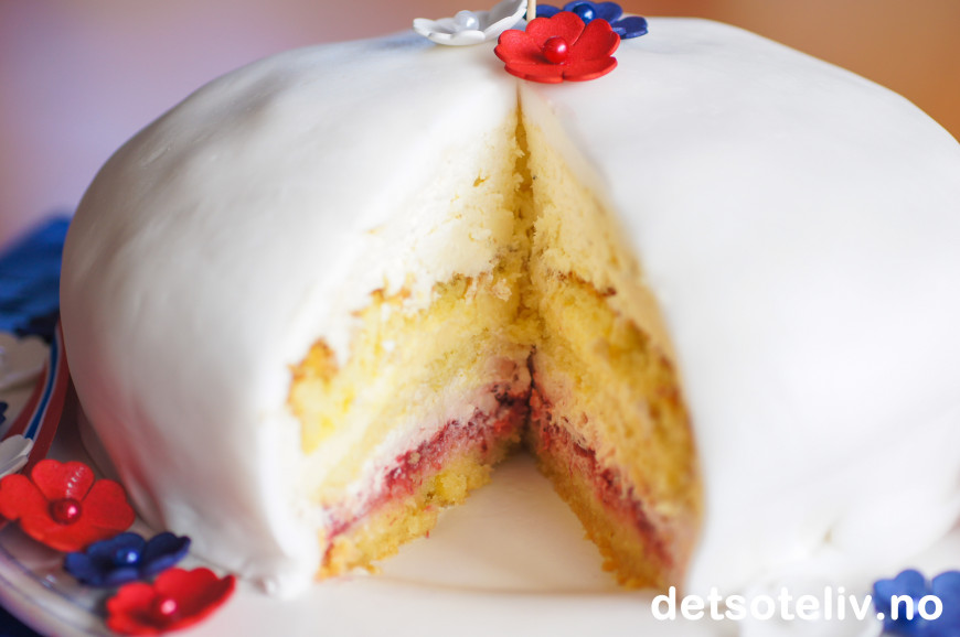 Bland resten av den piskede kremen med resten av vaniljekremen og fordel over hele kaken. Lag en kuppelfasong på toppen. Dekk kaken med hvitt marsipanlokk eller lokk av kjevlet fondant.