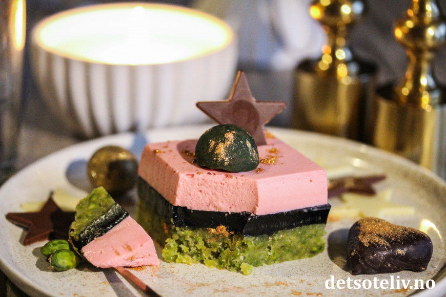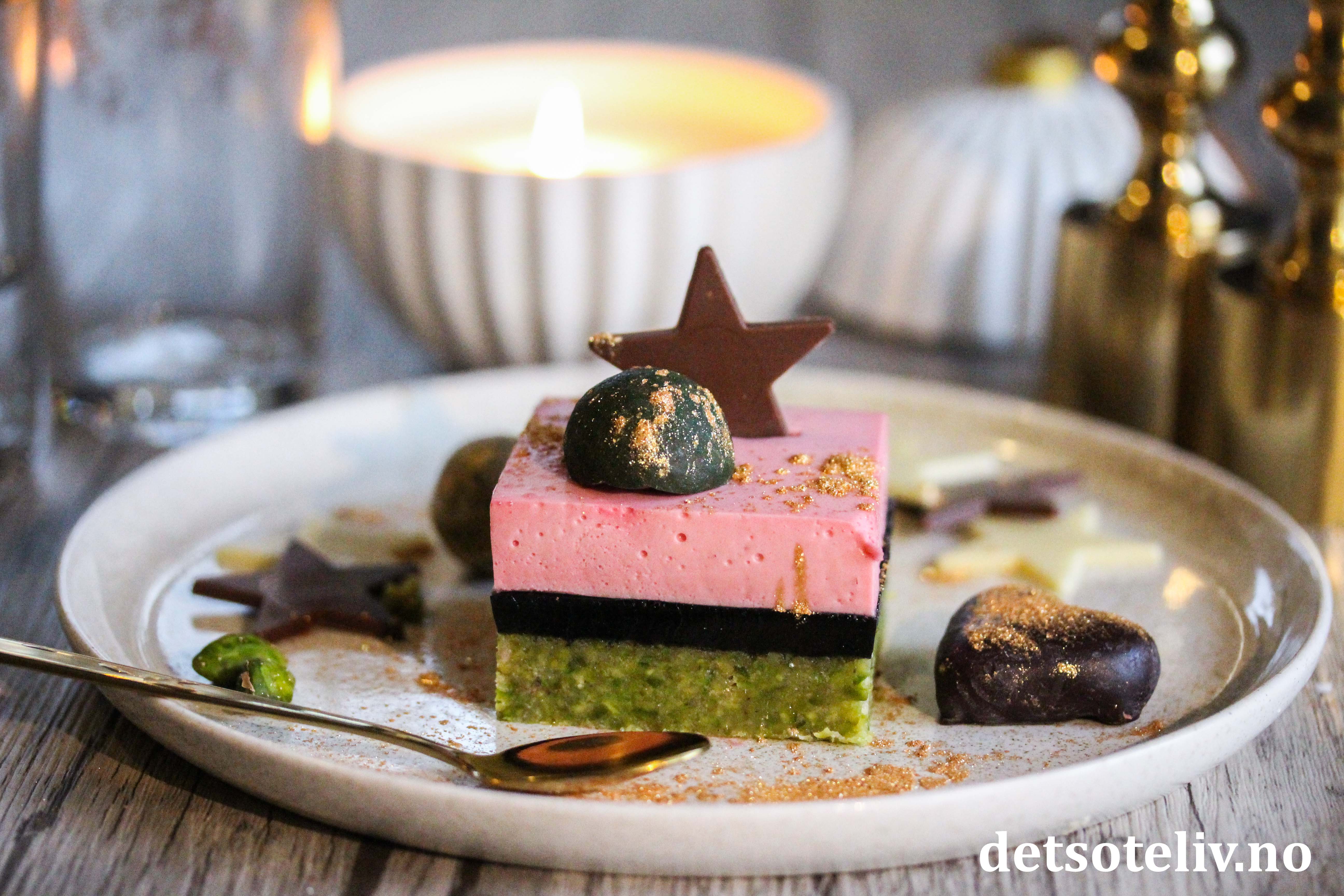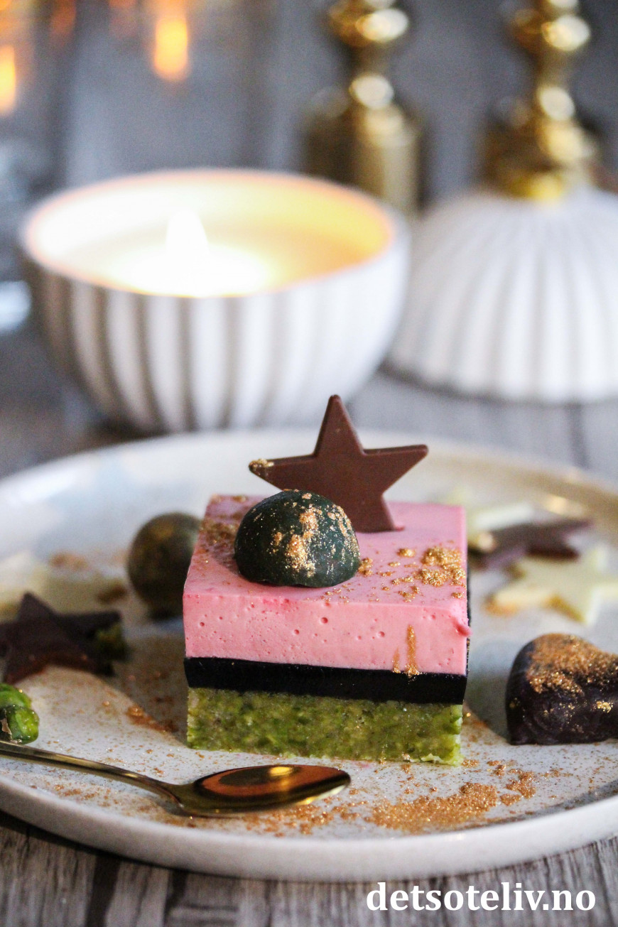 ♥ Det går fint å lage denne kaken over flere dager. For eksempel lage pistasjbunnen en dag, dekke med larisgelé den andre dagen og med bringebærfromasj den tredje dagen. Så kan kaken løftes ut av formen og serveres den fjerde dagen.