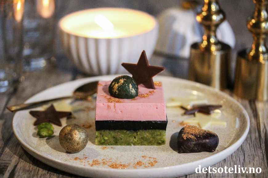 Denne kaken består av en tykk, myk, kjeksaktig pistasjbunn. Deretter følger et lag lakrisgelé som lages med smeltede lakrisbåter. På toppen dekkes kaken med en nydelig, fløyelsmyk bringebærfromasj.