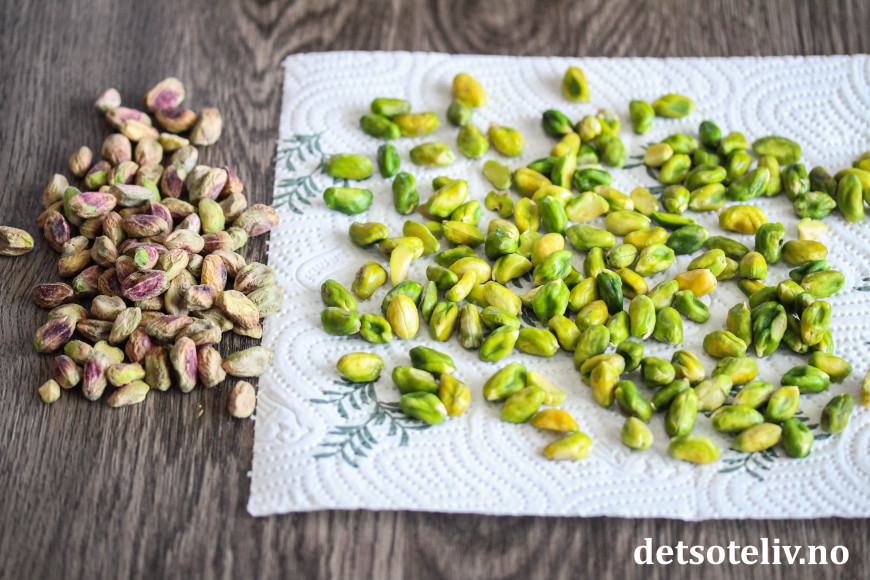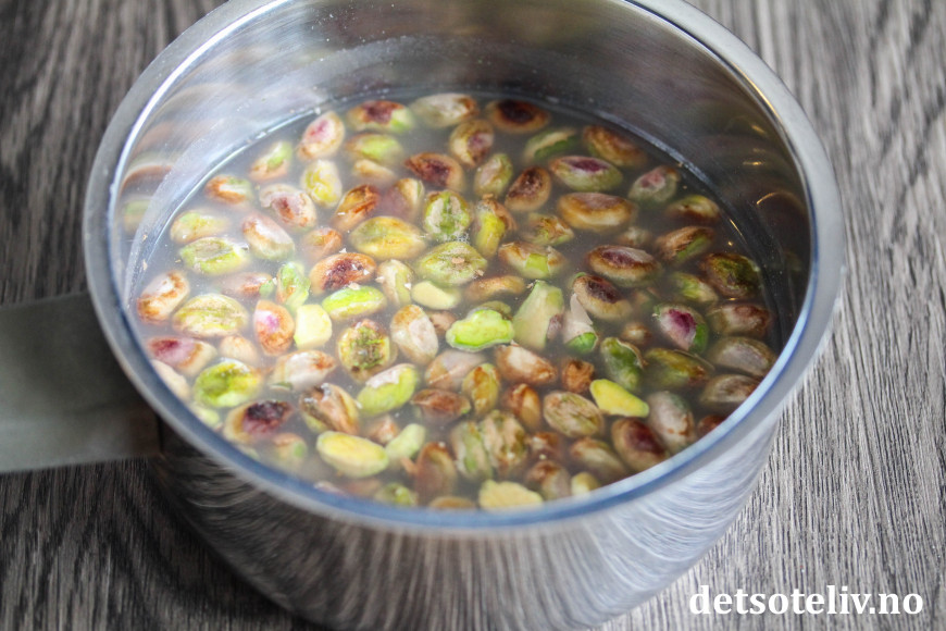 ♥ For å fjerne det ytterste skallet på pistasjnøttene, legger du dem en liten stund i varmt vann. Det er ikke meningen at nøttene skal kokes, bare legges i en kjele med varmt vann. Du vil etter hvert se at det ytre skallet løsner, slik at det er lett å gni det av. Skyll da vekk vannet og gni skallet av alle pistasjnøttene. Ikke la nøttene ligge i det varme vannet lenger enn nødvendig, for da kan de blir veldig bløte.