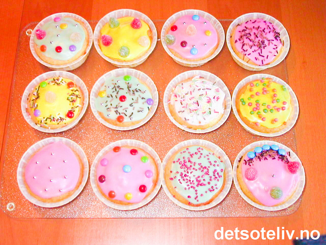 Pynt muffinsene med melisglasur og diverse kakepynt og godteri - bruk fantasien!