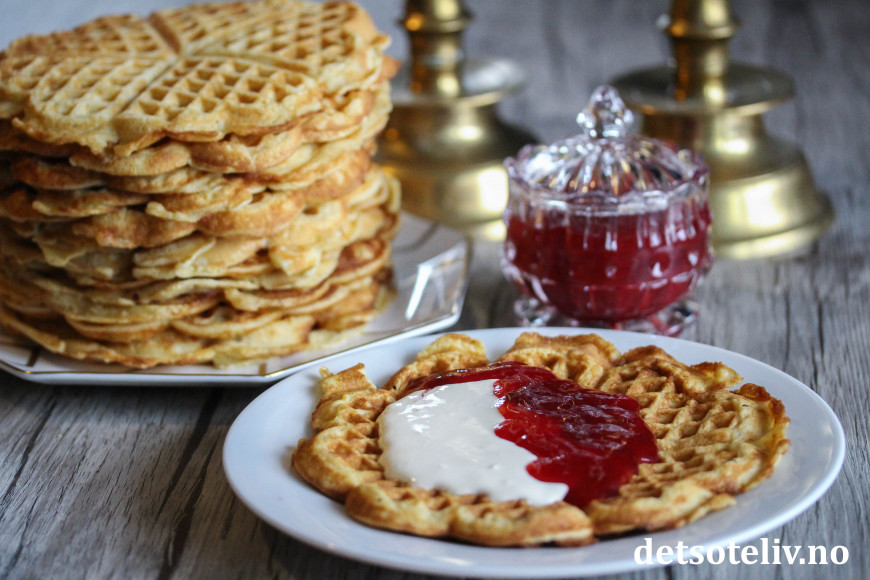 Stek vafler i vaffeljern på middels varme. Bruk eksta smør under stekingen eller spray vaffeljernet med formfett.