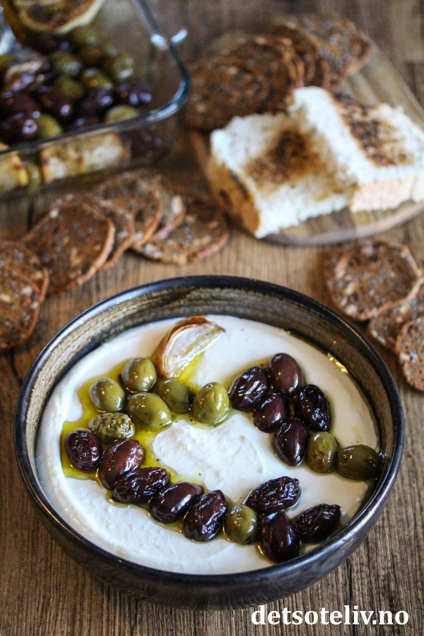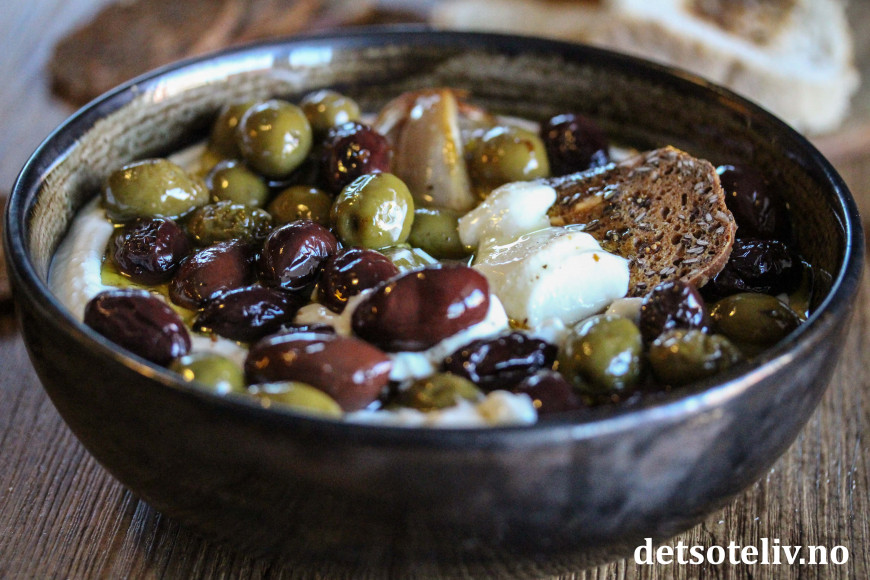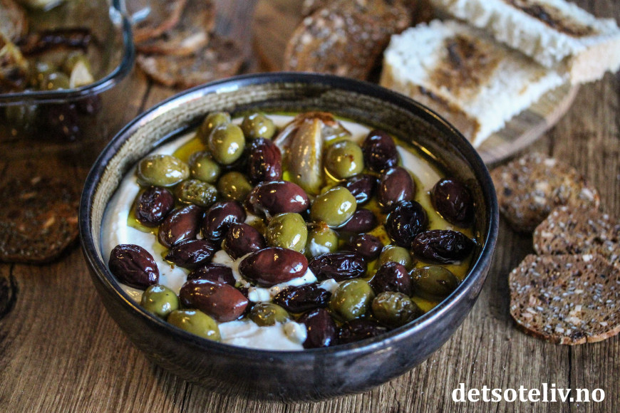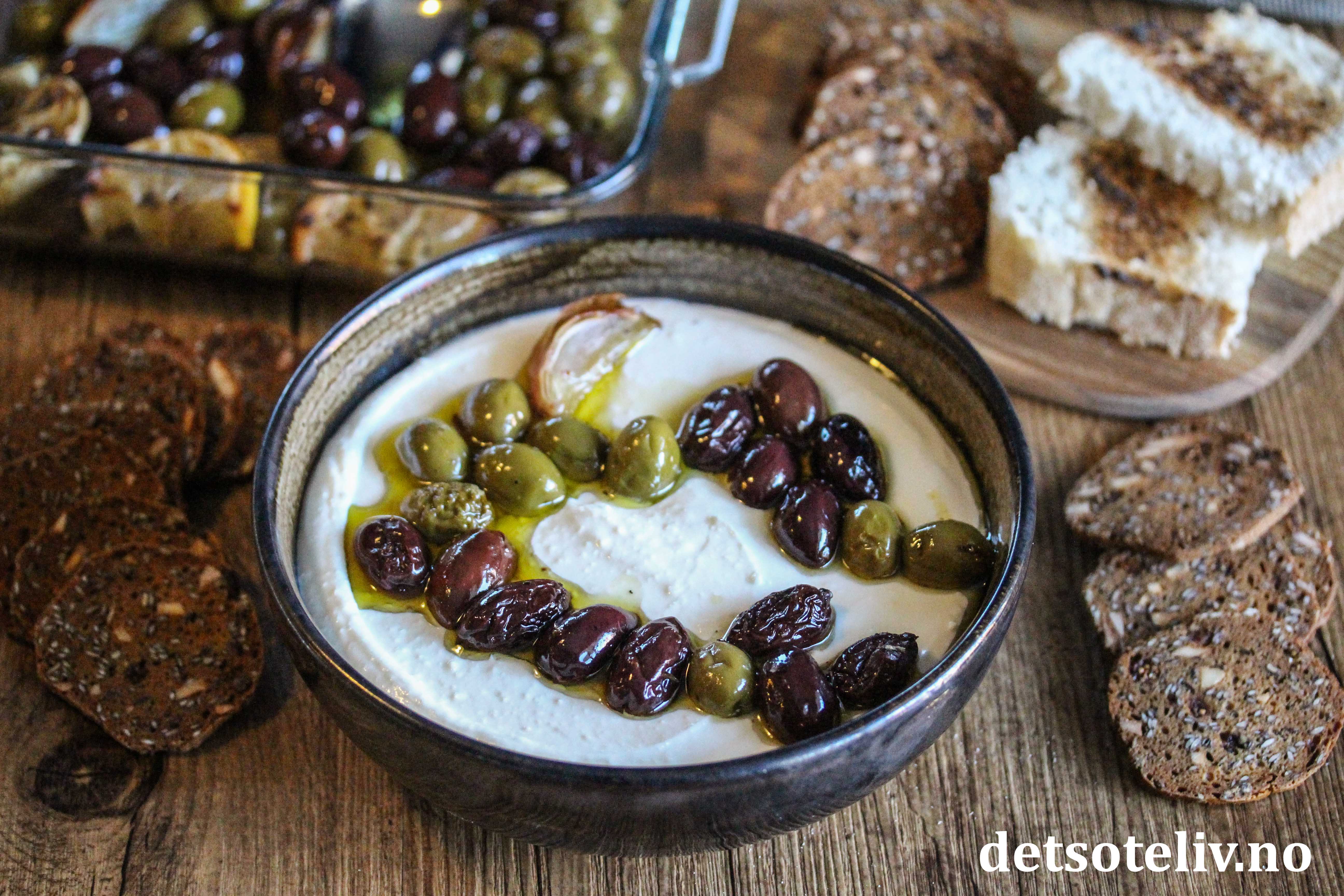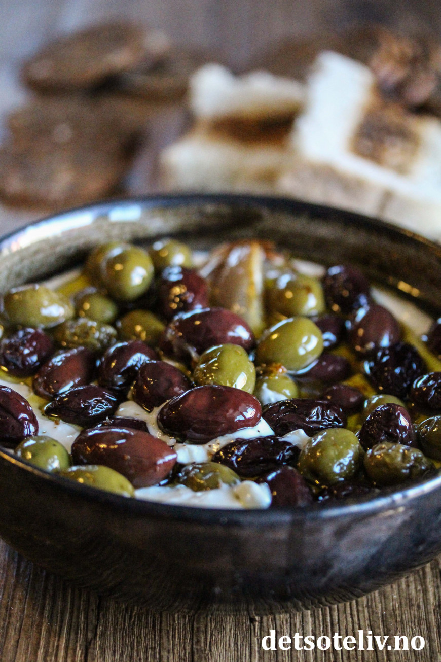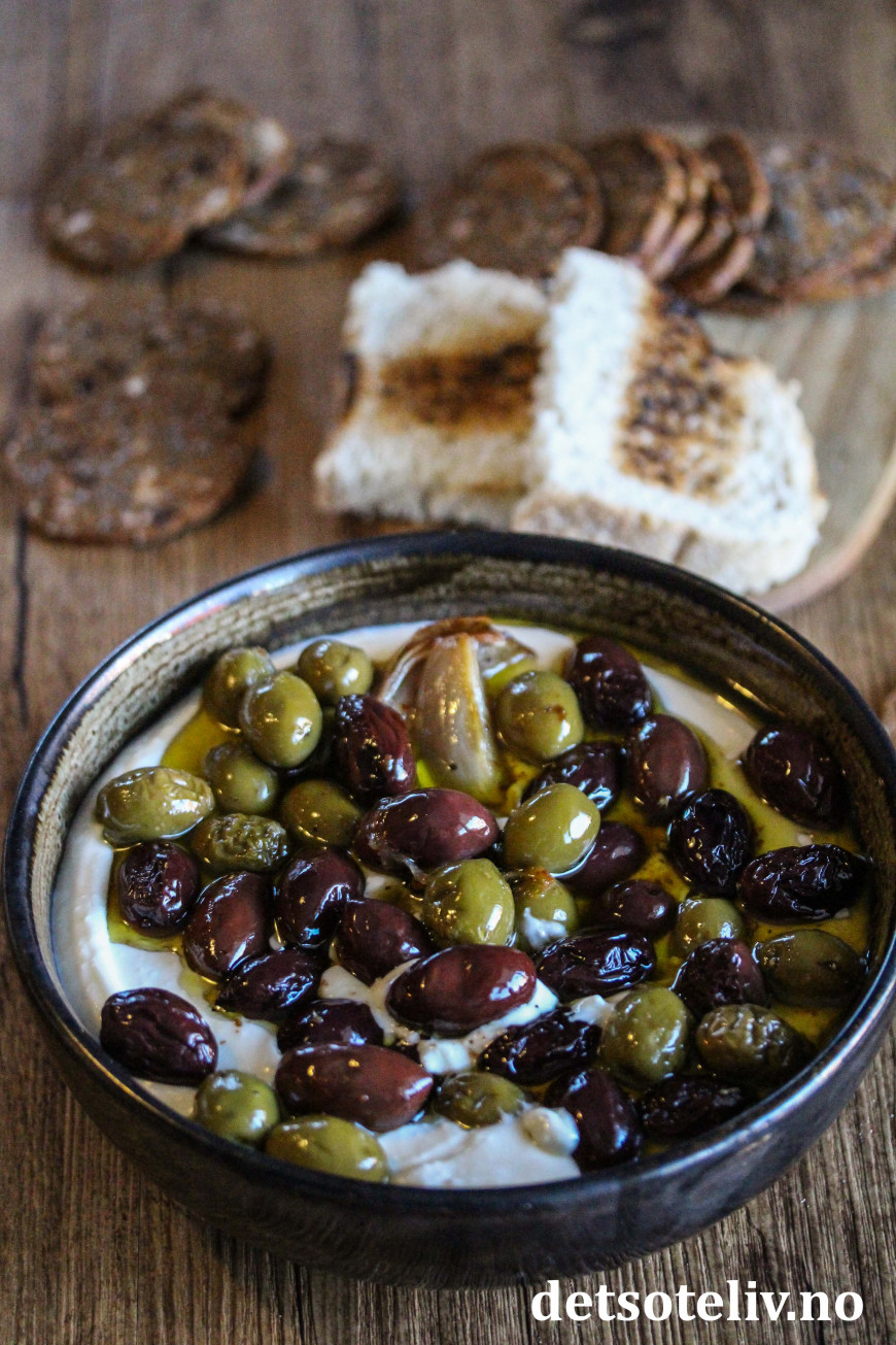 Her har jeg bakt oliven i ovnen sammen med god olivenolje, sjalottløk, hvitløk, sitron og krydder. Dette har jeg så brukt som topping oppå en deilig fetakrem laget med feta, kremost og honning. Serveres med kjeks og ristet loff.