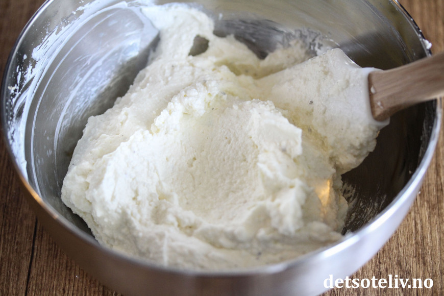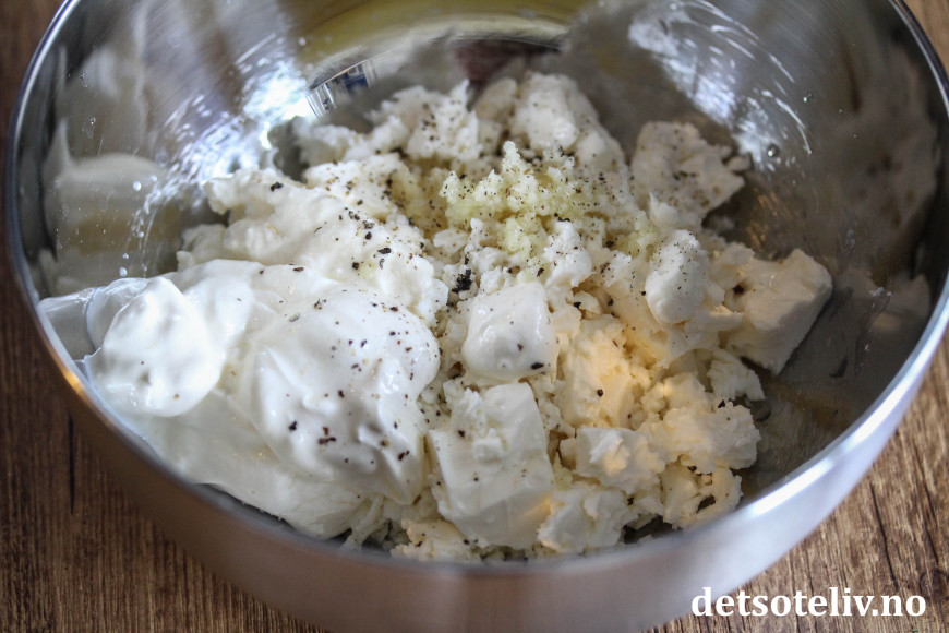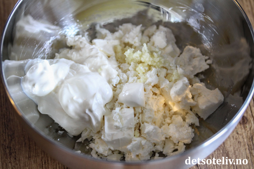 Smuldre fetaosten i en bolle. Tilsett rømme og hvitløk som er presset igjennom en hvitløkspresse.