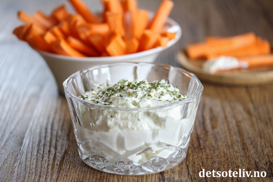 Fetakrem med hvitløk er også supergodt som dipp til chips eller grønnsaksstaver.