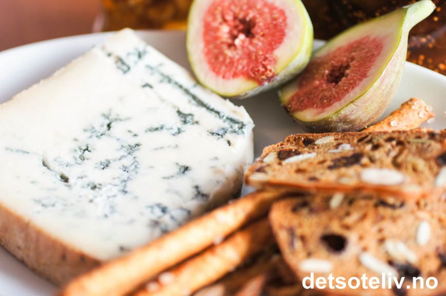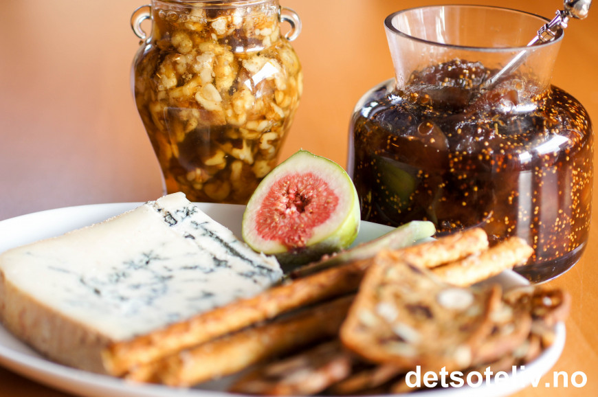 Fikenmarmeladen passer til mange slags oster, men jeg synes denne er spesielt god til litt kraftige blåskimmelsoster, som Roquefort, Stilton eller en Gorgonzola Piccante som jeg har her på bildet.