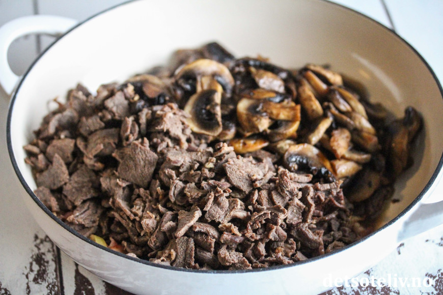 Smelt smøret i stekepannen. Del soppen i tykke skiver og stek dem møre i det varme smøret. Ha soppen deretter i gryten. Husk å koke ut stekepannen til slutt med litt vann slik at du får med all den gode smaken fra stekesjyen.