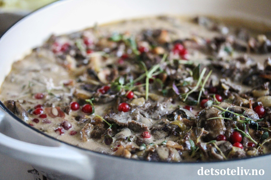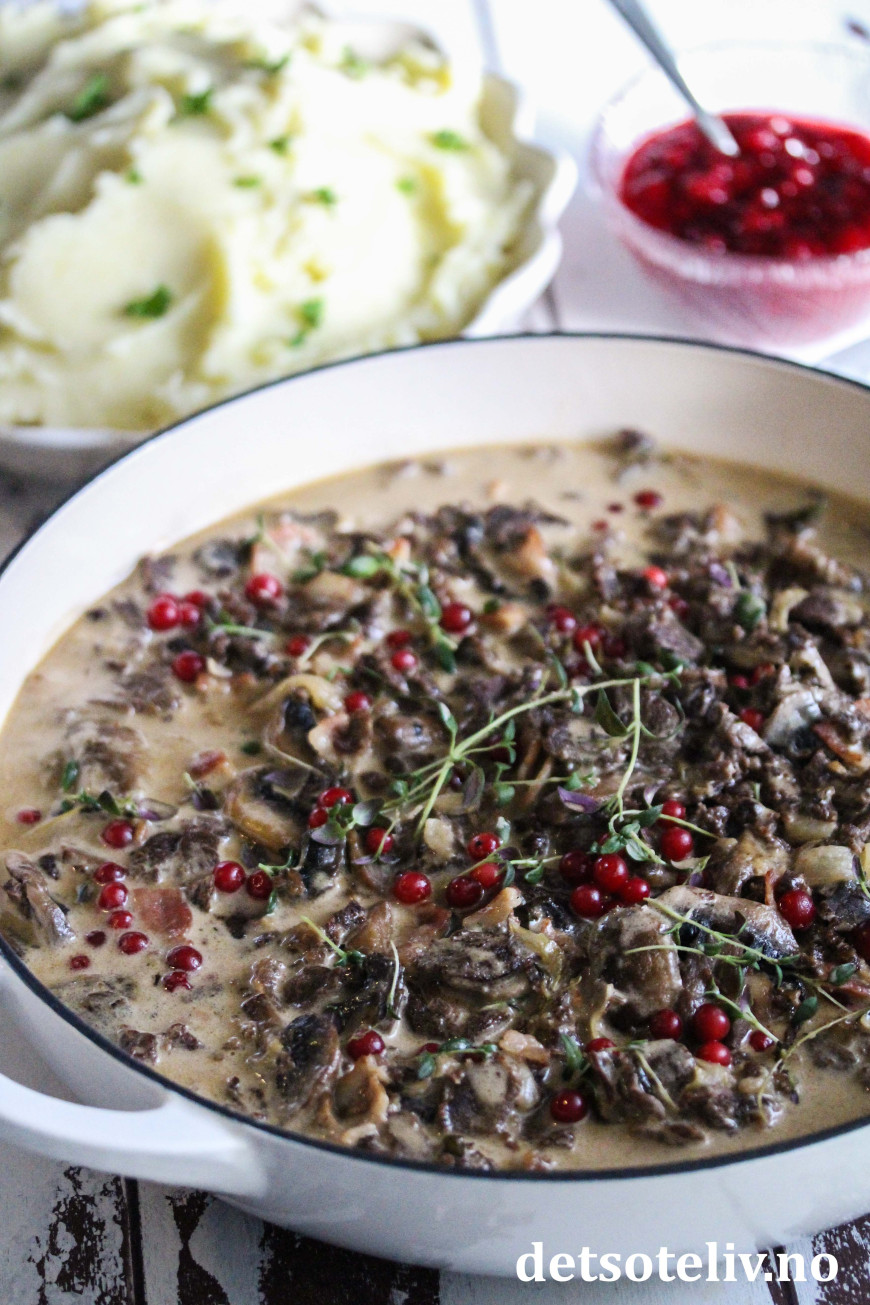 ♥ Det er ikke så godt å tygge på einebær og laurbærblad, så dette kan du gjerne fjerne mesteparten av fra gryten før servering. Tyttebærene som legges på toppen før servering blir derimot som deilige, småsyrlige smaksbomber i munnen - så anbefaler å ikke droppe det! 😊