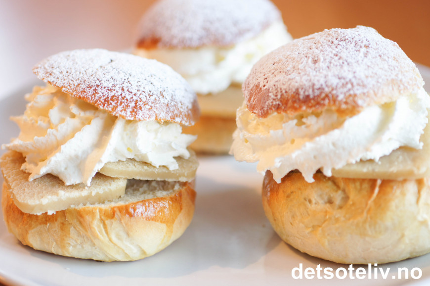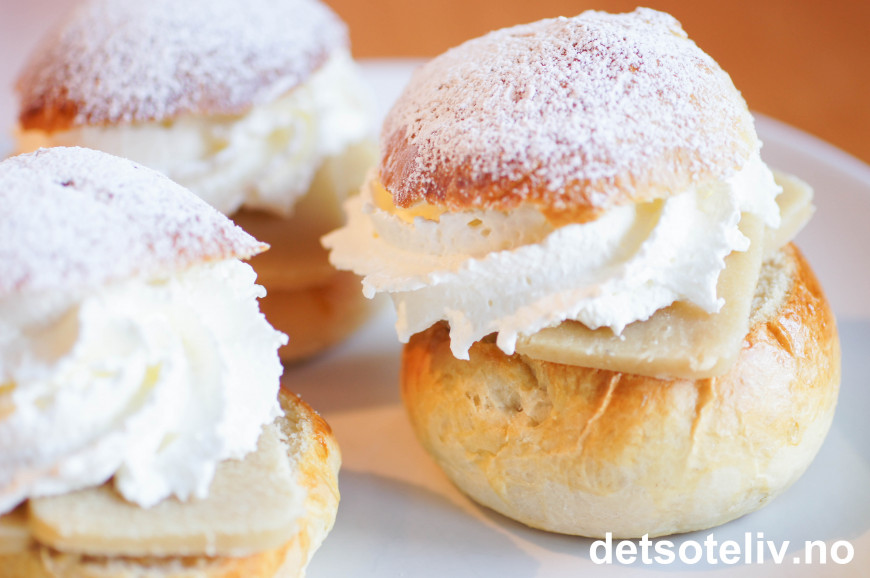 Før servering skjærer man av et lokk på bollene. Pisk kremfløten til stiv krem.