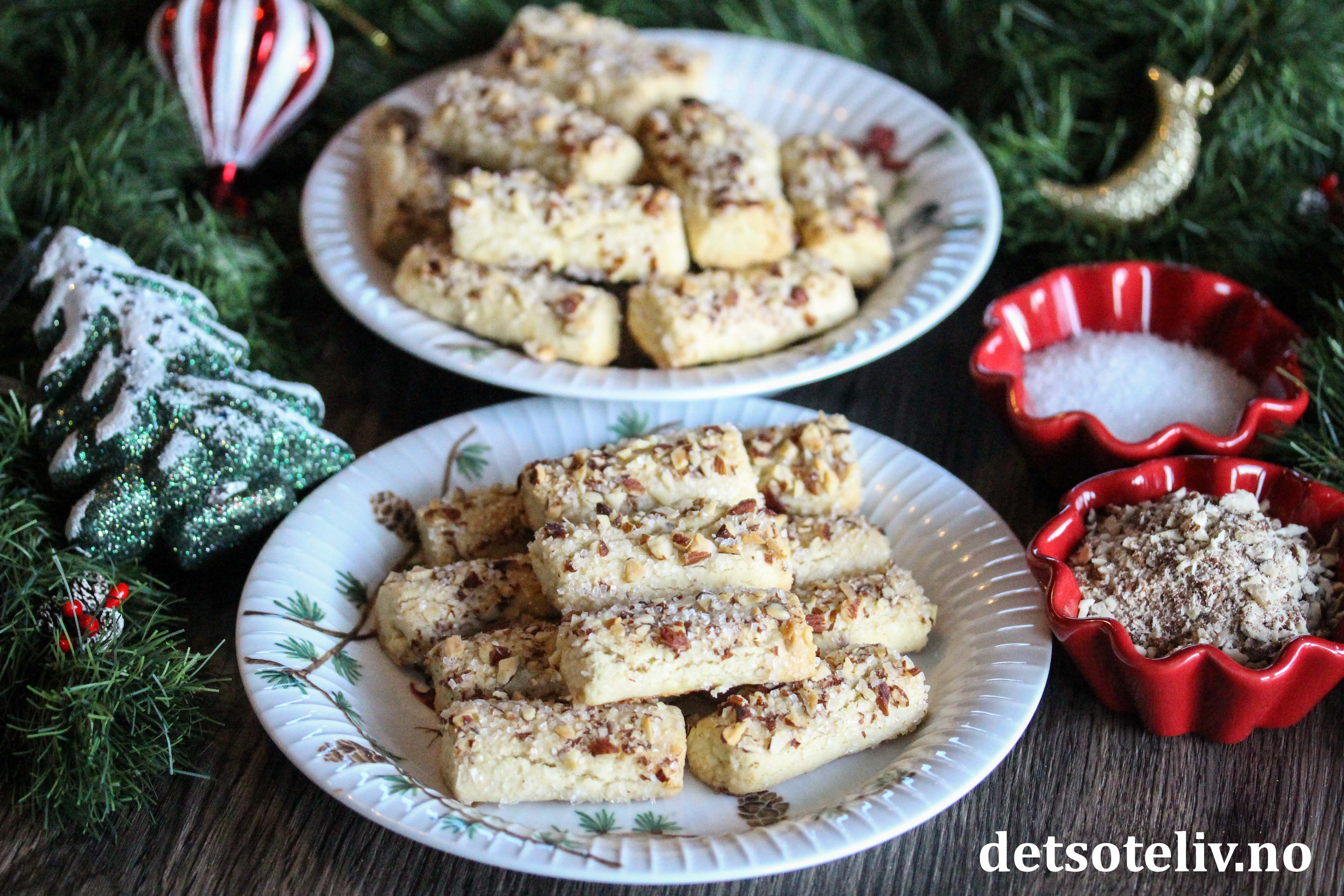 Skåld og mal mandlene. Bland med sukker, hvetemel og de malte mandlene i en bakebolle. Smuldre i mykt smør og kna deigen raskt sammen (deigen kan også kjøres raskt sammen i food processor).