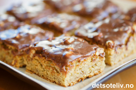 Bre deigen utover i en stor, bakepapirkledd langpanne (ca 30x40 cm). Bruk en smørekniv til å få deigen jevnt utover. Stek kaken på nederste rille i ovnen ved 175°C i 30-35 min. Avkjøl kaken i formen. Hvelv kaken ut av formen og fjern bakepapiret.