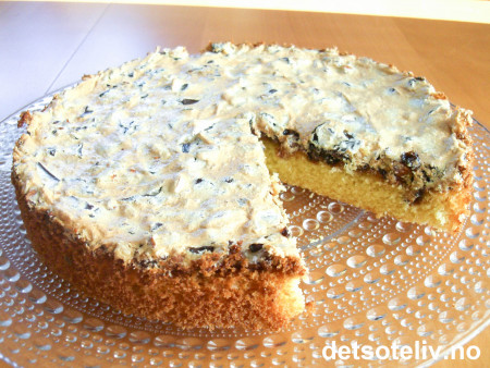 Ta den stekte kaken ut av ovnen. Fordel marengsen oppå kaken. Sett kaken tilbake i ovnen ved samme tempratur og stek den videre til marengsen er gyllenbrun, ca 10 minutter.