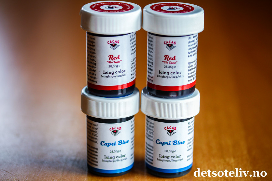 De to siste gangene jeg har laget denne har jeg brukt Cacas icing farge til kakebunnene, og det har vært mer en nok med 1 boks av hver farge. Fargen ser kanskje litt mørk turkis ut når bunnen er stekt (som på bildene ovenfor her), men er tydelig mørk blå når kaken er montert sammen.