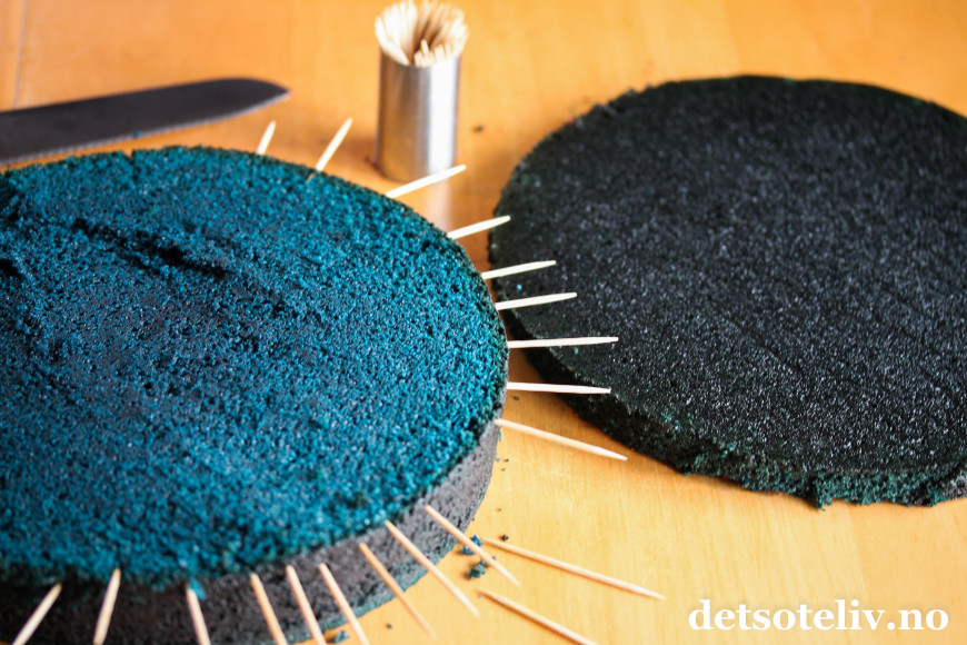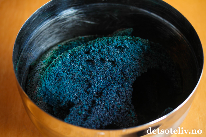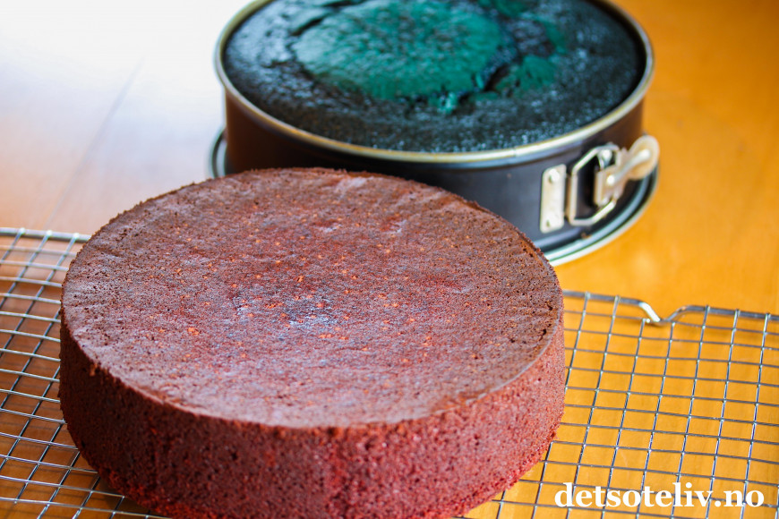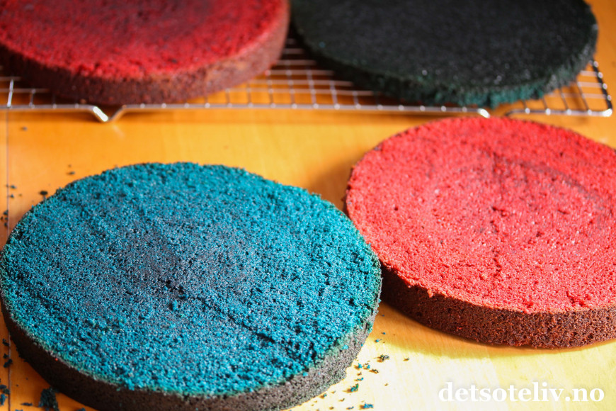 Gjenta samme prosess for å lage den blå kakebunnen. La gjerne begge kakebunnene stå på rist i romtemperatur over natten, godt pakket inn i plast. Da stabiliseres bunnene og blir lettere å skjære opp uten å smule for mye.
