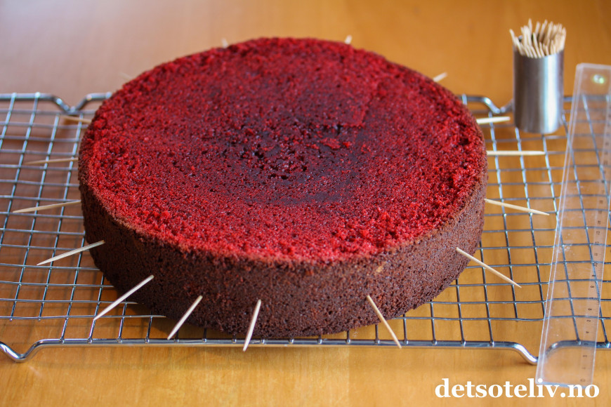Start med å beskjære den røde kaken: Skjær først av toppen av kaken, så den blir helt rett. Skjær eventuelt også vekk et tynt lag fra bunnen hvis den har blitt litt brun. Del kaken så på midten så du får 2 like høye kakebunner (de vil bli ca. 2,5- 3 cm høye).