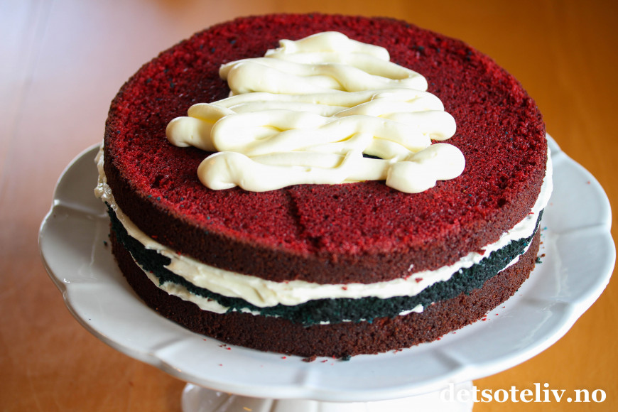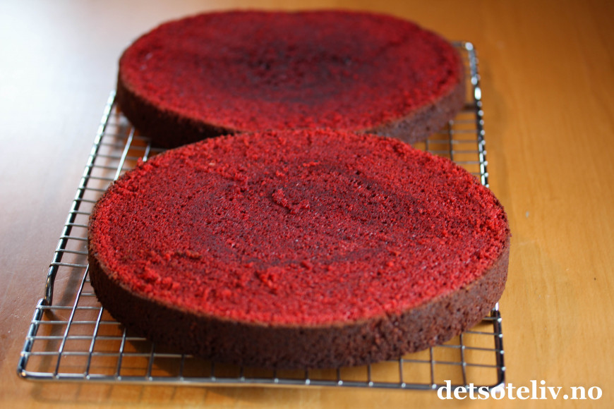 Start med å lage den røde kakebunnen: Pisk egg og sukker til eggedosis. Bland i de øvrige ingrediensene i angitt rekkefølge, og visp til du får en jevn og klumpfri og rødfarget deig. Ha deigen i en rund kakeform (26 cm i diameter) med bakepapir i bunnen. Stek kaken midt i ovnen ved 180 grader i ca. 1,5 timer (sjekk med kakenål at kaken er helt gjennomstekt i midten). Avkjøl kaken på en rist.