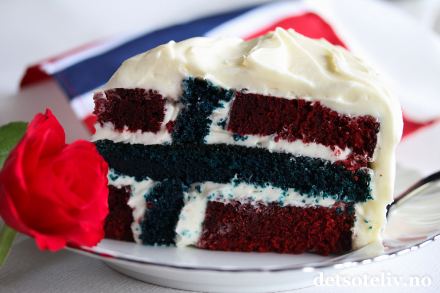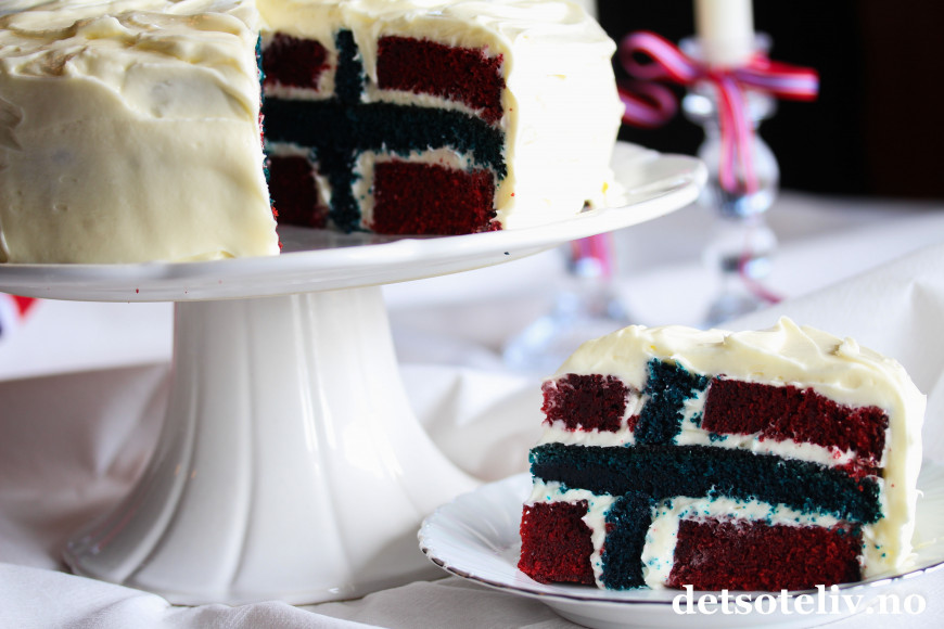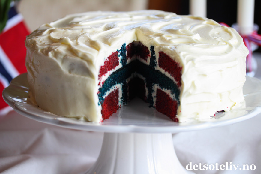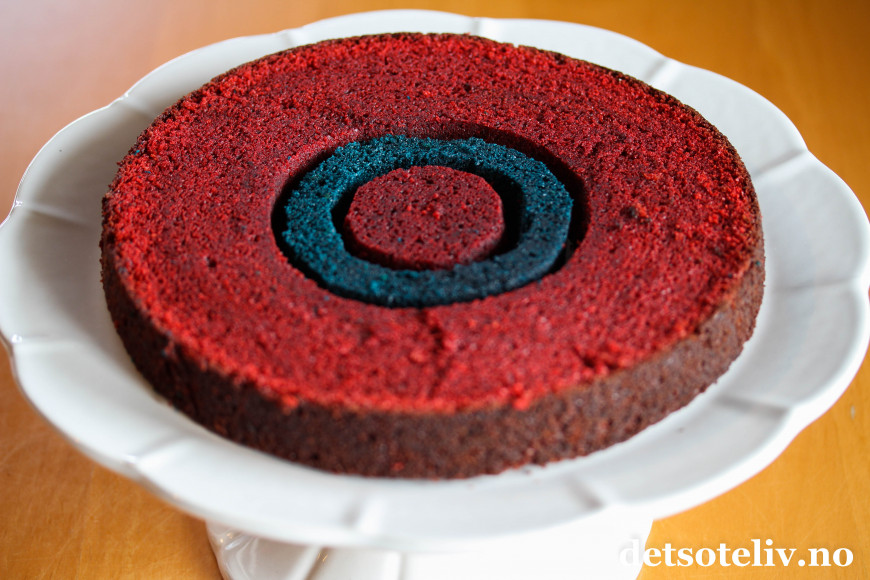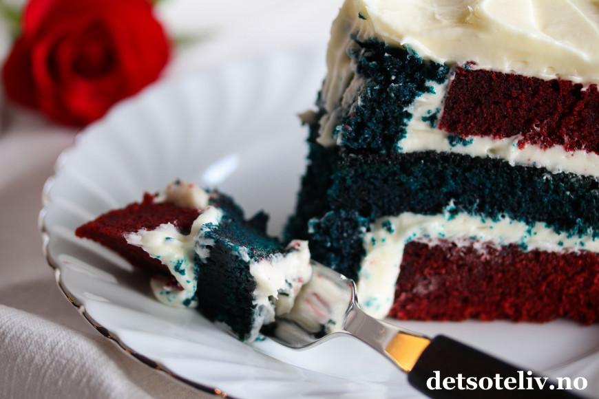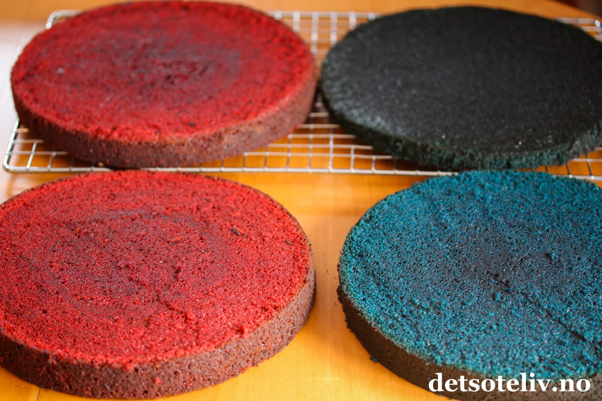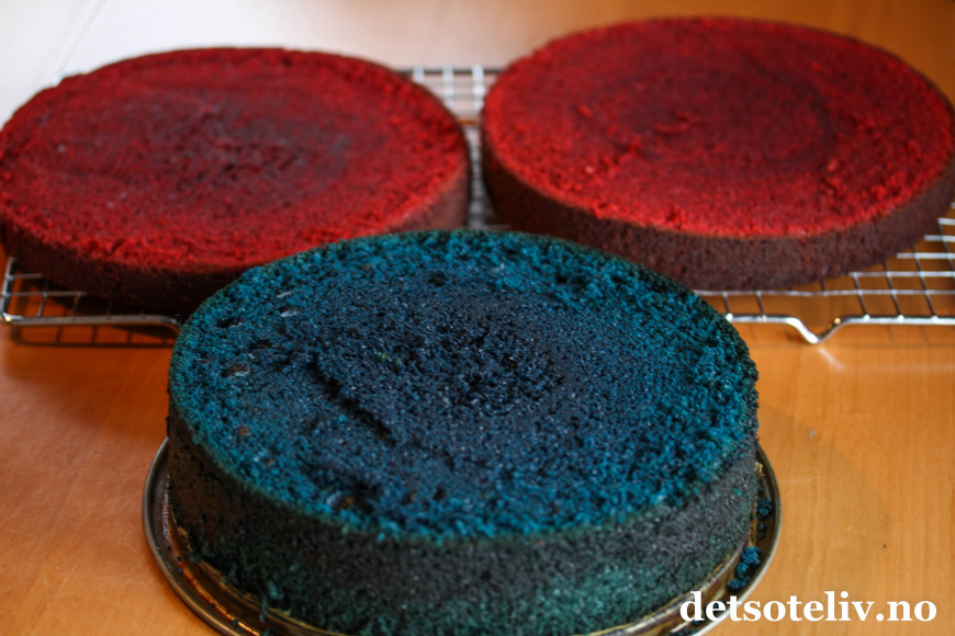 ♥ Oppskriften er basert på en amerikansk "Red Velvet"-kake, som lages i både rød og blå farge. Det er viktig at man bruker konsentrert konditorfarge (såkalt pastafarge), så kakebunnene får tydelig rød og blå farge. Dette fås kjøpt i en rekke kjøkkenutstyrsbutikker og nettbutikker som selger kakepynteutstyr.