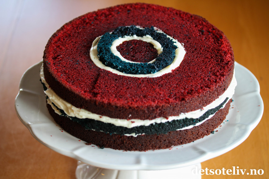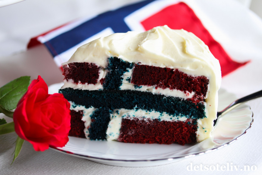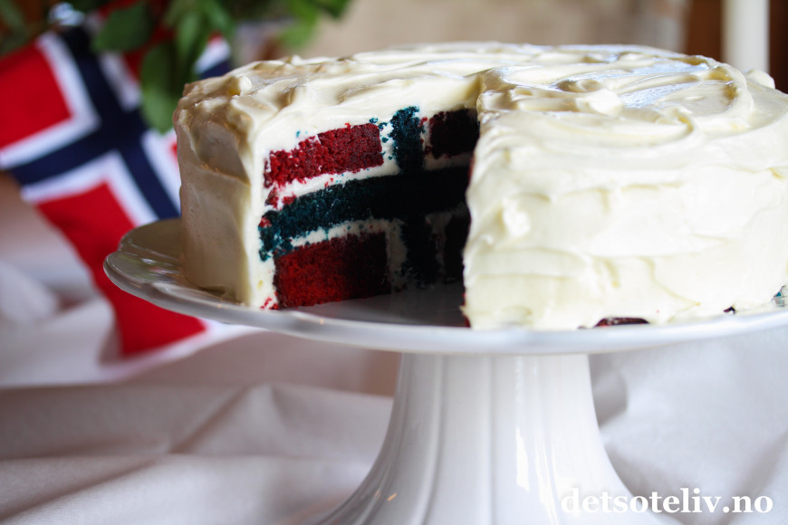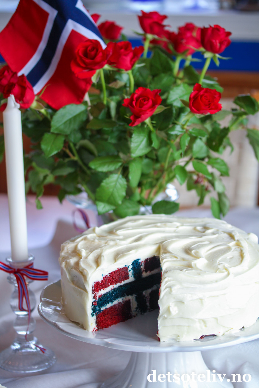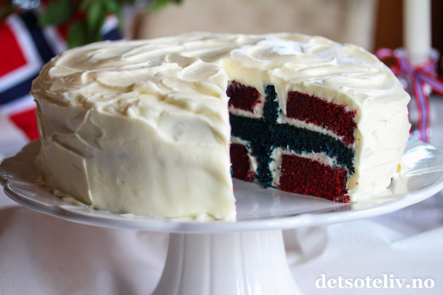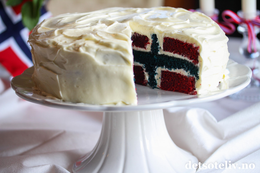 ♥ Oppskriften er basert på en amerikansk "Red Velvet"-kake, som lages i både rød og blå farge. Det er viktig at man bruker konsentrert konditorfarge (såkalt pastafarge), så kakebunnene får tydelig rød og blå farge. Dette fås kjøpt i en rekke kjøkkenutstyrsbutikker og nettbutikker som selger kakepynteutstyr.