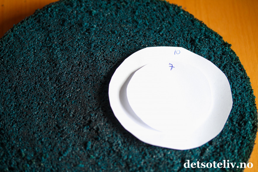Legg papirsirkelen som måler 7 cm på hver av de to kakene som nå er på 10 cm i diameter og skjær rundt.