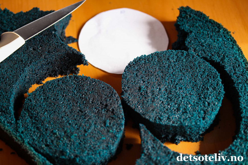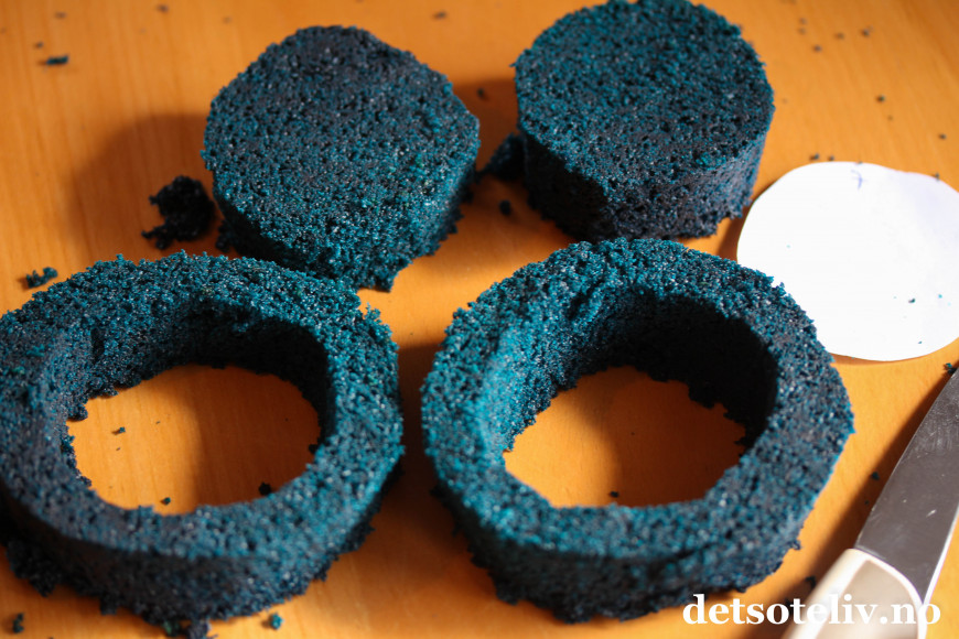 Papirsirklene som er på 7 cm og 10 cm brukes til å beskjære den tykke, blå kakebunnen (den tynne, blå kakebunnen skal ikke beskjæres). Skjær ut to runde kaker som er 10 cm i diameter. Legg papirsirkelen som måler 7 cm på hver av de to kakene som nå er på 10 cm i diameter og skjær rundt. Fjern kaken i de innerste sirkelene, slik at du ender opp med 2 blå kakeringer som er ca. 1,5 cm brede. Spar på blå kakerester; du får bruk for noe av dette ved montering av kaken.