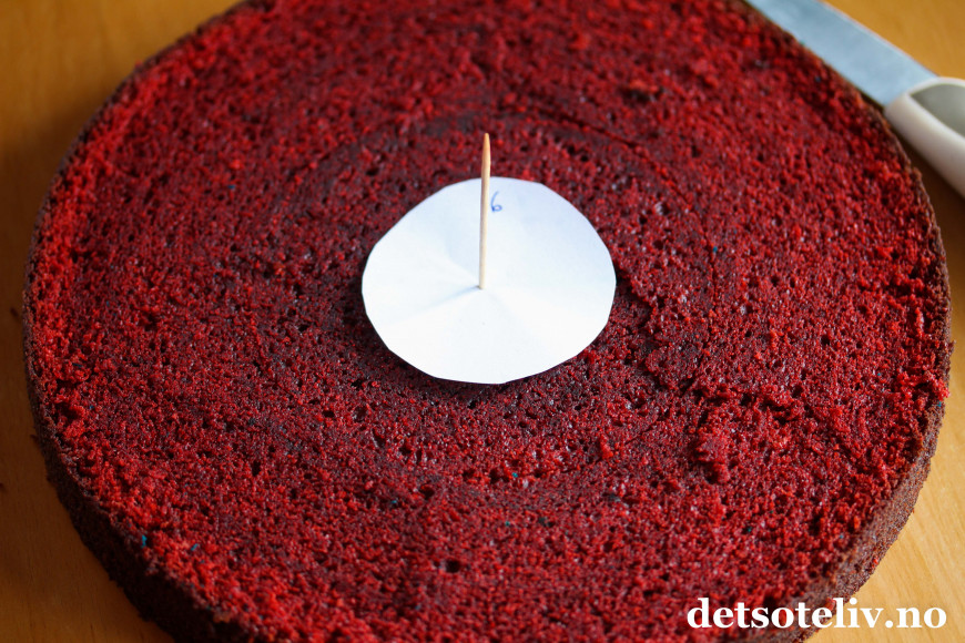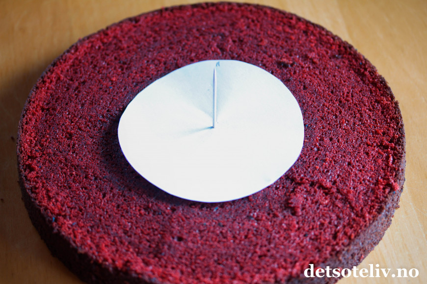Lag en sirkel på 20 cm som du kutter av den rød kakebunnen (26cm i diameter) med. Da får du 3 cm ytterst.