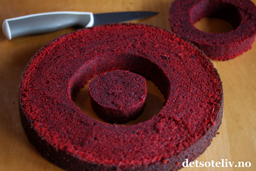 Innerst så lager du en sirkel på ca. 13 cm og kutter rundt på den rød kakebunnen. Da får ca. 6.5cm innerst i stedet for 3 cm.