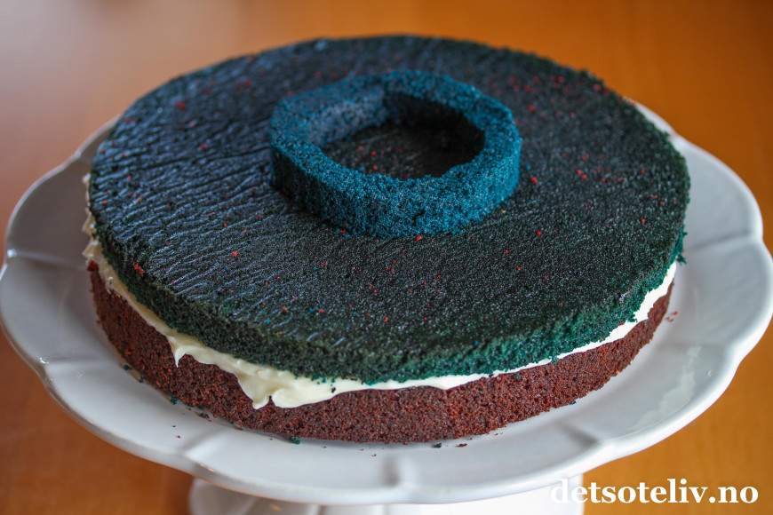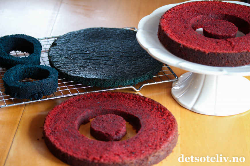 Tips for å gjøre det litt enklere: det er ingen grunn til å beskjære den høyeste blå bunnen til samme høyde som de rød, for deretter å bygge opp de blå ringene igjen med smuler. La den bare være høyere enn de rød, så slipper man både en ekstra beskjæring og smuler som er vriene å holde på plass og glasere.