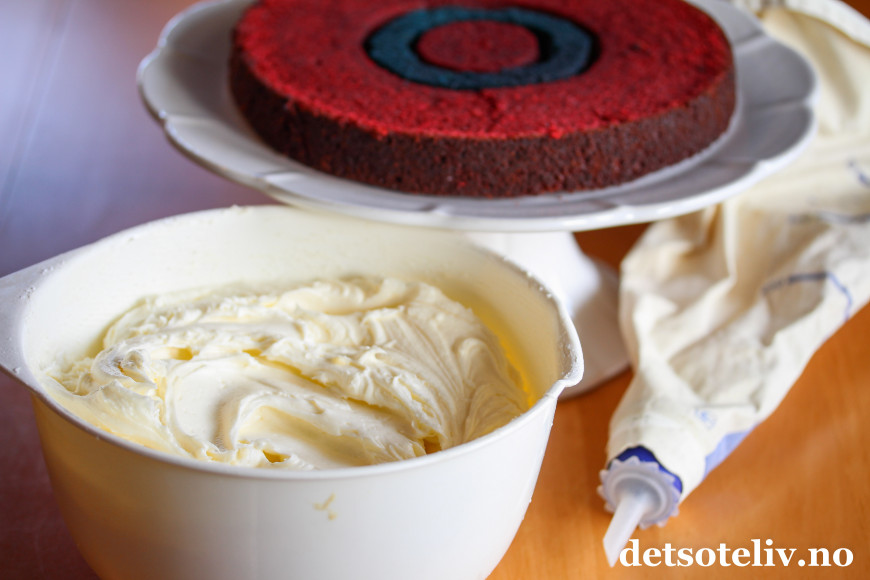 Legg en liten rød kake (6 cm), en blå kakering (10 cm) og deretter en stor, rød kakering på et kakefat. Fyll hulrommene mellom blå og røde kaker ved å sprøyte inn ostekrem.