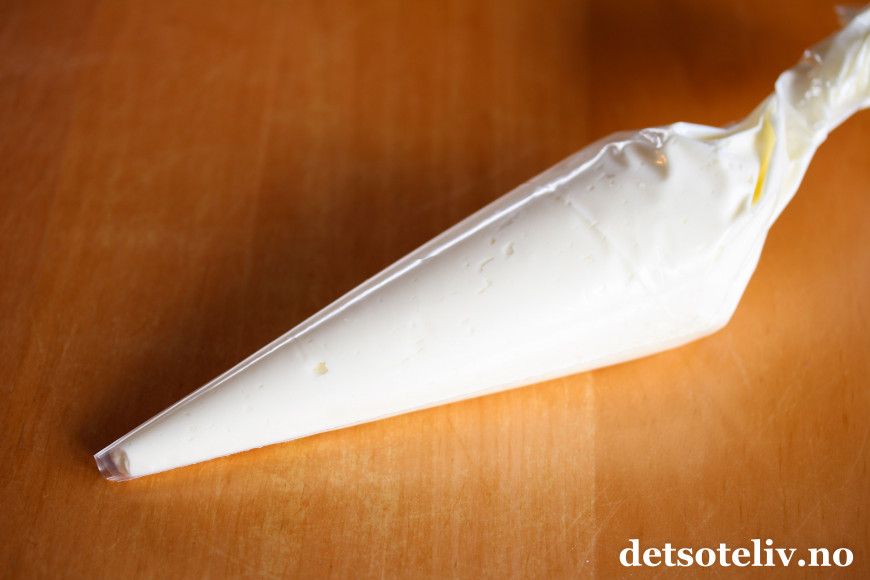 Visp sammen ingrediensene til ostekremen. Gjør klar en sprøytepose og klipp et hull i enden.