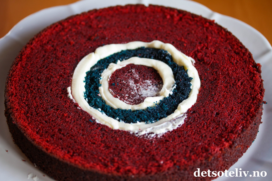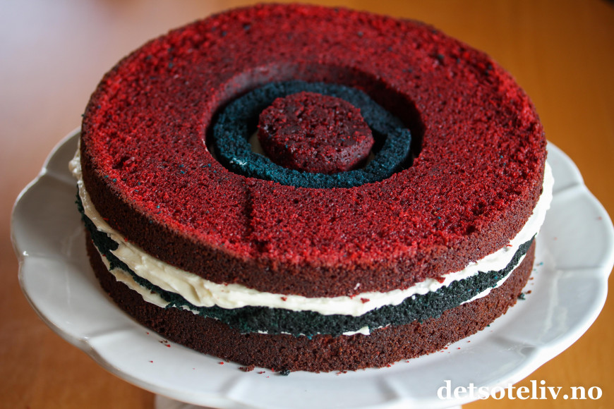 Legg på den siste røde kakeringen og den lille, røde kaken i midten. Fyll igjen opp mellomrommet mellom blå og røde kaker ved å sprøyte inn ostekrem. Hvis den blå kaken igjen er litt lavere, kan du fylle på med blå kakerester for å få samme høyde på kaken.