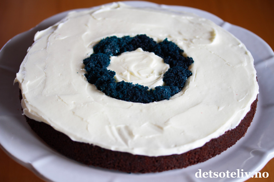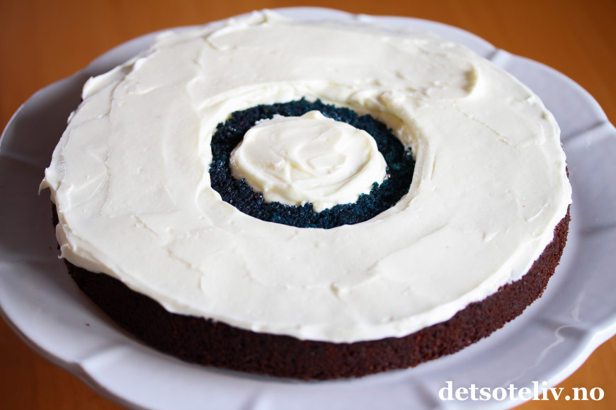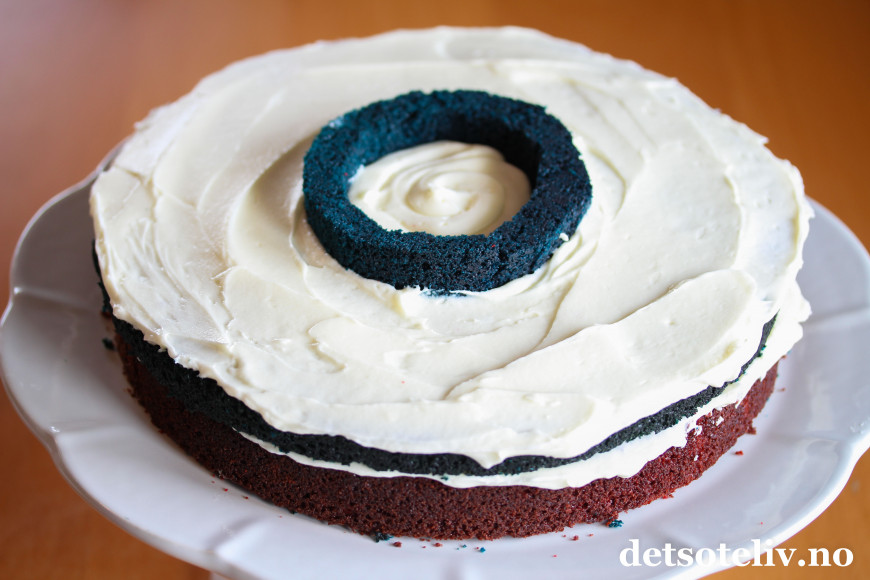 Fyll ostekrem inni sirkelen og på resten av den blå kakebunnen, men ikke noe oppå den blå kakeringen.