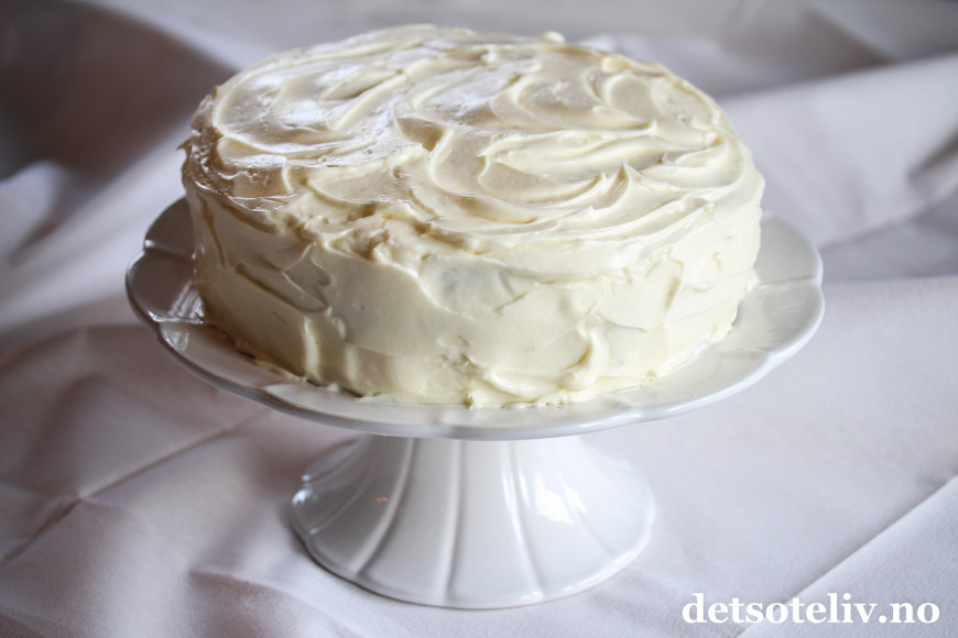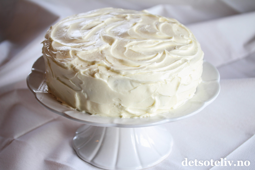 Deretter dekker jeg hele kaken med et tykt lag ostekremen, så kaken blir helt hvit.